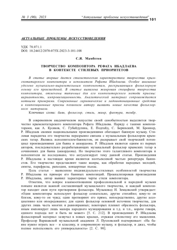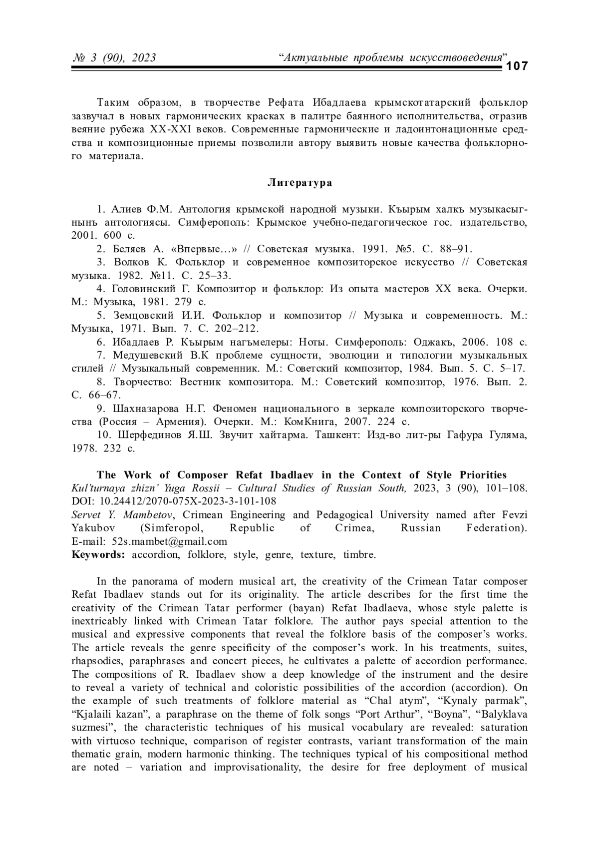 В современном академическом искусстве своей самобытностью выделяется творчество крымскотатарского композитора Рефата Ибадлаева. Наряду с такими композиторами, как А. Кусяков, С. Губайдулина, Е. Подгайд, С. Беринский, М. Броннер, Р. Ибадлаев своими национальными произведениями обогащает баянную музыку. Стилевая парадигма его творчества неразрывно связана с музыкальным фольклором крымских татар. Являясь исполнителем-баянистом, он раскрывает свой творческий потенциал произведениями для баяна и аккордеона. Р. Ибадлаев является одним из первых авторов, последовательно разрабатывающих музыкальный фольклор крымских татар в сочинениях для баяна (аккордеона). Но творчество этого талантливого композитора и исполнителя не исследовано, что актуализирует тему данной статьи. Произведения Р. Ибадлаева в настоящее время являются неотъемлемой частью репертуара баянистов. Его творчество представляют такие жанры, как обработки народных мелодий, сюиты, парафразы, рапсодии, концертные пьесы