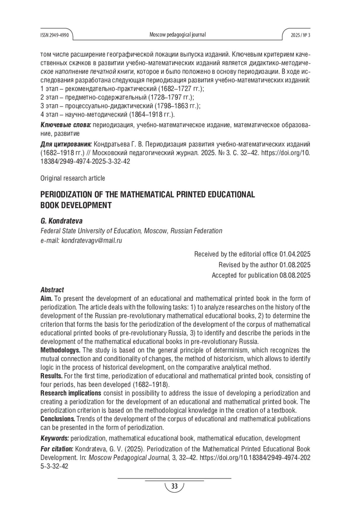 Теоретическая и/или практическая значимость. Осуществлена целостная реконструкция процесса развития учебно-математической литературы (1682-1918 гг.), представленная в виде периодизации, что расширяет сферу современного историко-педагогического знания о процессах эволюции отечественного математического образования в контексте развития учебной книги. Выявлен ключевой критерий развития учебного издания: его методико-дидактическое наполнение.