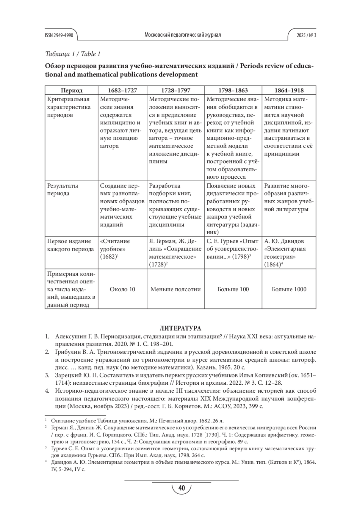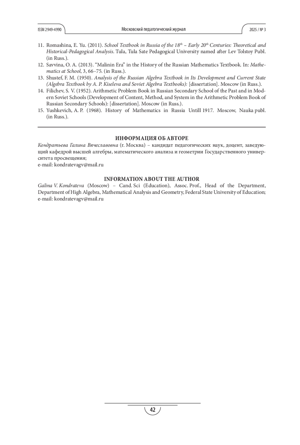 8. Кондратьева Г. В. Педагоги-математики пореформенной России. К вопросу о развитии отечественного учебника математики в петровскую эпоху // Фундаментальные проблемы обучения математике, информатике и информатизации образования. Сборник тезисов докладов международной научной конференции (Елец, 29 сентября-1 октября 2023 года). Елец: Елецкий государственный университет им. И. А. Бунина, 2023. С. 241-243. EDN: ATSVRB