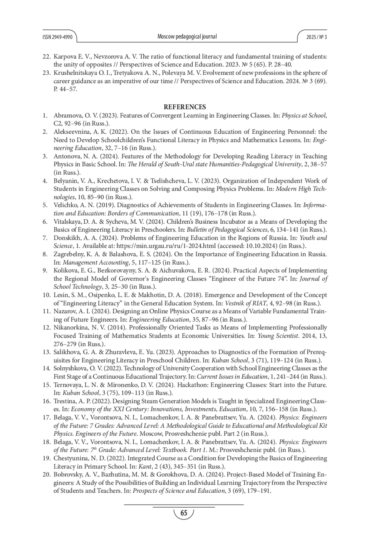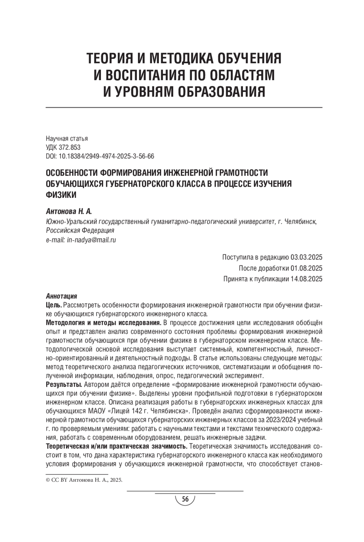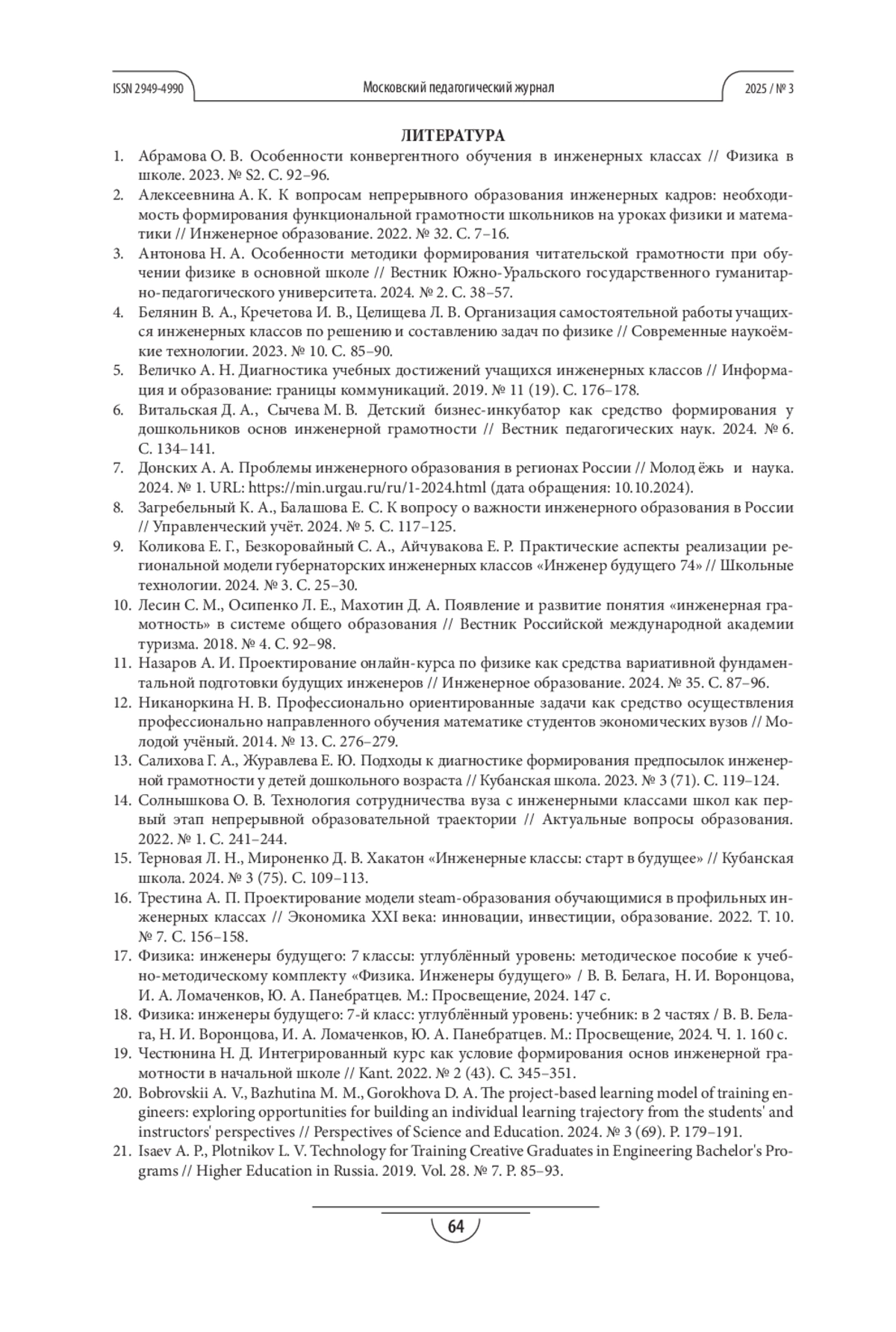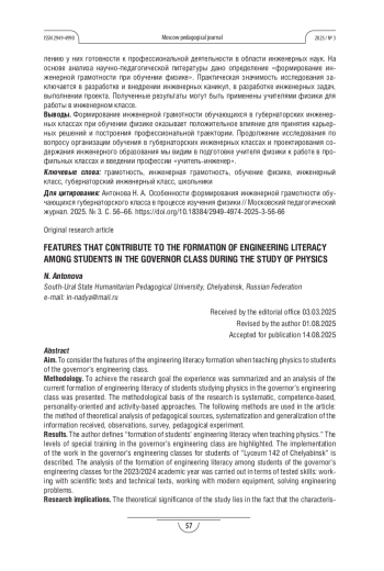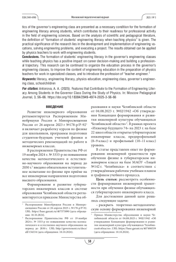 АНТОНОВА Н. А. ОСОБЕННОСТИ ФОРМИРОВАНИЯ ИНЖЕНЕРНОЙ ГРАМОТНОСТИ ОБУЧАЮЩИХСЯ ГУБЕРНАТОРСКОГО КЛАССА В ПРОЦЕССЕ ИЗУЧЕНИЯ ФИЗИКИ // МОСКОВСКИЙ ПЕДАГОГИЧЕСКИЙ ЖУРНАЛ. 2025. № 3