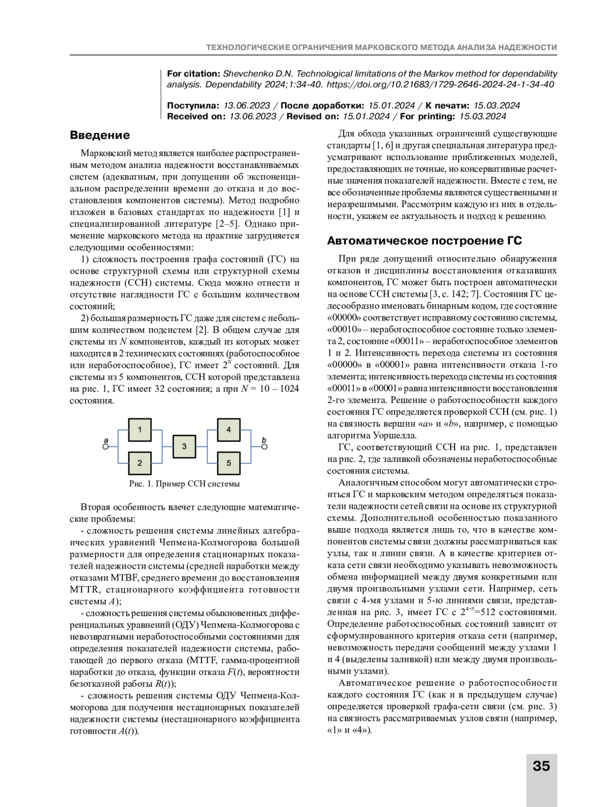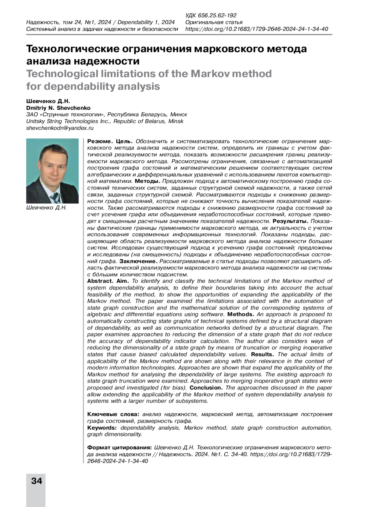 Цель. Обозначить и систематизировать технологические ограничения марковского метода анализа надежности систем, определить их границы с учетом фактической реализуемости метода, показать возможности расширения границ реализуемости марковского метода. Рассмотрены ограничения, связанные с автоматизацией построения графа состояний и математическим решением соответствующих систем алгебраических и дифференциальных уравнений с использованием пакетов компьютерной математики.