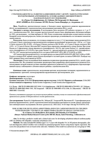 Chueva KA, Kofeynikova OA, Tatarskiy RB, et al. Risk factors for the development of tachycardia-induced cardiomyopathy in children with idiopatic ventricular arrhythmia. Children’s Heart and Vascular Diseases. 2024; 21 (4): 297-304 (in Russ.). DOI: 10.24022/1810-0686-2024-21-4-297-304