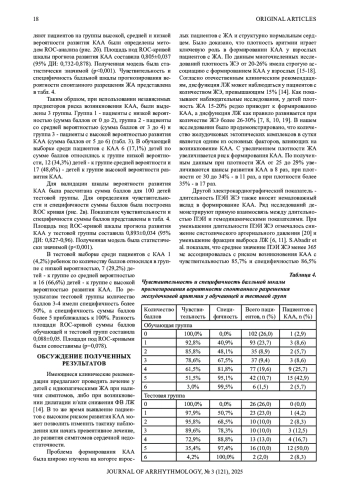 Результаты. Было установлено, что площадь поверхности тела ≥ 1,7 м2 увеличивает шансы развития КАА в 4,9 раза (1 балл), длительность предэктопического интервала желудочковой экстрасистолы < 434 мс - в 3,7 раза (1 балл), плотность ЖА 25-29% - в 8,4 раза (2 балла), плотность ЖА 30-34% - в 11,3 раза (3 балла), плотность ЖА ≥35% - в 17,2 раза (4 балла). Методом ROC анализа была определена специфичность суммы баллов. При сумме баллов до 2 определялась низкая вероятность (специфичность <48,1%), при сумме баллов 3-4 - средняя вероятность (специфичность 67,5-81,8%), при сумме баллов 5-6 - высокая вероятность развития КАА (специфичность >95,1%). AUC шкалы прогноза развития КАА составила 0,805±0,037 (95% ДИ: 0,732-0,878), p<0,001. AUC шкалы прогноза развития КАА у тестовой группы составила 0,893±0,034 (95% ДИ: 0,827-0,96), p<0,001. Разность площади ROC-кривой суммы баллов обучающей и тестовой групп составила 0,088±0,05. Площади под ROC-кривыми были сопоставимы (p=0,078).
