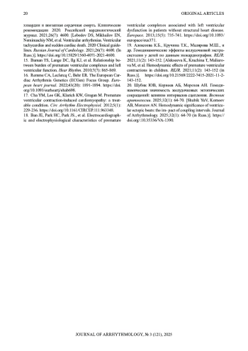 20. Шубик ЮВ, Корнеев АБ, Морозов АН. Гемодинамическая значимость желудочковых эктопических сокращений: влияние интервалов сцепления. Вестник аритмологии. 2025;32(1): 64-70.