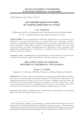 В статье анализируются проблемы организации и осуществления денацификации в послевоенной Германии и ее исторический опыт. Показаны отличия в подходах к проведению и формах денацификации в советской и западной зонах оккупации, оценивается эффективность процесса денацификации Германии. На этой основе делаются выводы об уроках денацификации для современного мира и факторах денацификации и освобождения от компрадорского, неофашистского, русофобского, бандеровского режима на Украине.