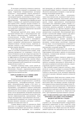 В статье представлены современные методы анестезиологического пособия, используемые в ходе выполнения таких интервенционных и хирургических вмешательств как имплантация кардиостимуляторов, устройств сердечной ресинхронизирующей терапии, кардиовертеров-дефибрилляторов и проведения катетерной аблации. Обсуждаются преимущества, недостатки и проблемные вопросы анестезии в зависимости от типа вмешательства и состояния пациента. На основании проанализированных данных делается вывод о том, что анестезия в ходе вмешательств у пациентов аритмологического профиля является общемировой практикой и подчеркивается положительное влияние методов анестезии на качество и безопасность выполняемых процедур.