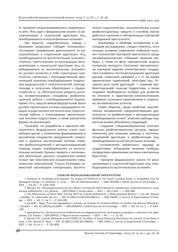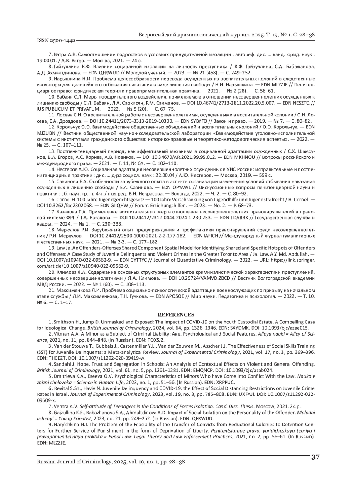 6. Ревиталь С.Ш. Ювенальная преступность и COVID-19: влияние ограничений социального дистанцирования на уровень преступности среди несовершеннолетних в Израиле / С.Ш. Ревиталь, Н. Хавив. 10.1007/s11292-022-09509-x. // Журнал экспериментальной криминологии. - 2023. - Том 19, № 3. - С. 785-808. DOI: 10.1007/s11292-022-09509-x.JournalofExperimentalCriminology.-2023.-Vol.19 EDN: UXFAJ
