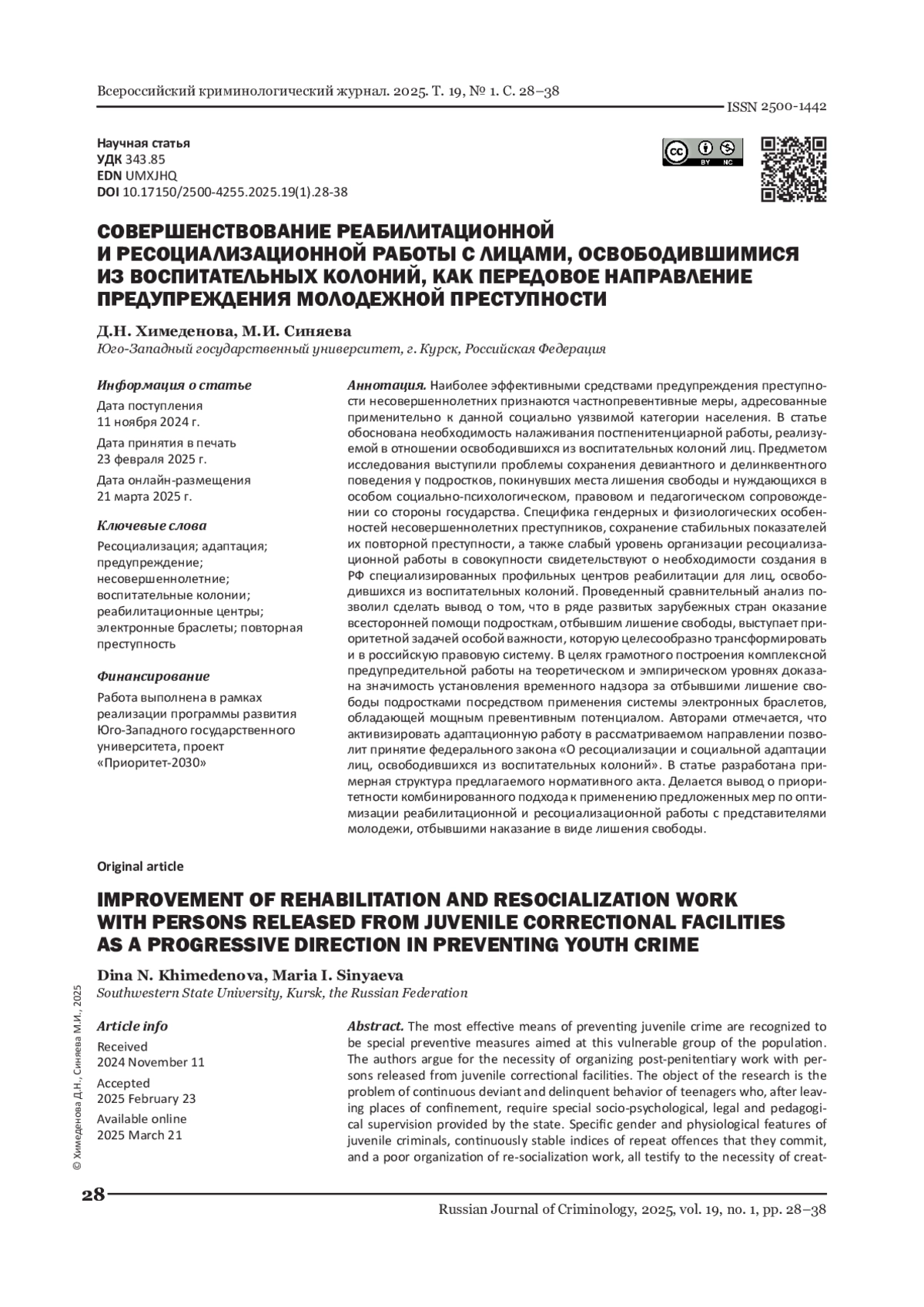 Наиболее эффективными средствами борьбы с преступностью несовершеннолетних признаются частнопревентивные меры, адресованные непосредственно к данной социальной уязвимости категории населения. В статье обоснована необходимость налаживания постпенитенциарной работы, реализуемой в отношении освободительных изтельных воспитателей колоний лиц. Предметом исследования серьезных проблем сохранения девиантного и делинквентного поведения у подростков, покинувших место лишения свободы и нужды в особом социально-психологическом, правовом и педагогическом сопровождении со стороны государства. Специфика географических и последствий особенностей несовершеннолетних королевств, сохранение стабильных показателей их повторяемости преступности, а также слабый уровень организации ресоциализационной работы в обеспечении необходимости создания в РФ специализированных профильных центров реабилитации для лиц, освободившихся из воспитательных колоний. Проведенный сравнительный анализ позволяет сделать вывод о том, что в ряде случаев оказываемая странами всесторонняя помощь подросткам, отбывшим свободу свободы, играет приоритетную роль в особой важности, которую лидер трансформирует и в российскую правовую систему. В целях грамотного построения комплексной предупредительной работы на теоретическом и эмпирическом уровне доказана первоначательность временного надзора за лишением свободы подростками посредством применения системы электронных браслетов, обладающих мощным превентивным потенциалом. Авторами отмечается, что активизация адаптационной работы в рассматриваемом направлении позволяет принять федеральный закон «О ресоциализации и социальной адаптации лиц, освободившихся из воспитательных колоний». В статье разработана примерная структура предлагаемого нормативного акта. Делается вывод о приоритетности комбинированного подхода к применению предложенных мер по оптимизации реабилитационной и ресоциализационной работы с постепенной ликвидацией, отбывшей явление в виде лишения свободы.