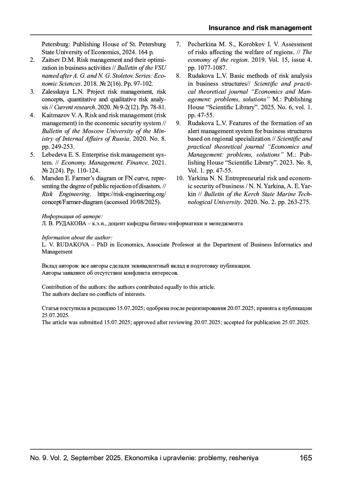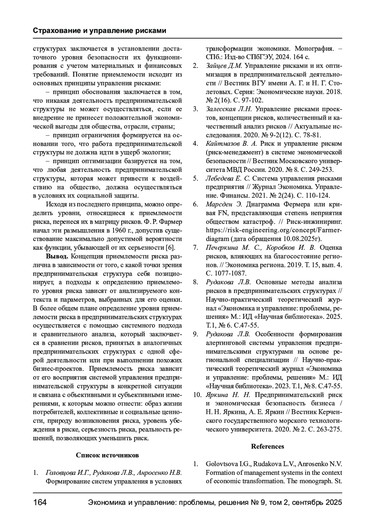 8. Рудакова Л.В. Основные методы анализа рисков в предпринимательских структурах // Научно-практический теоретический журнал “Экономика и управление: проблемы, решения” М.: ИД “Научная библиотека”. 2025. Т.1, № 6. С.47-55.