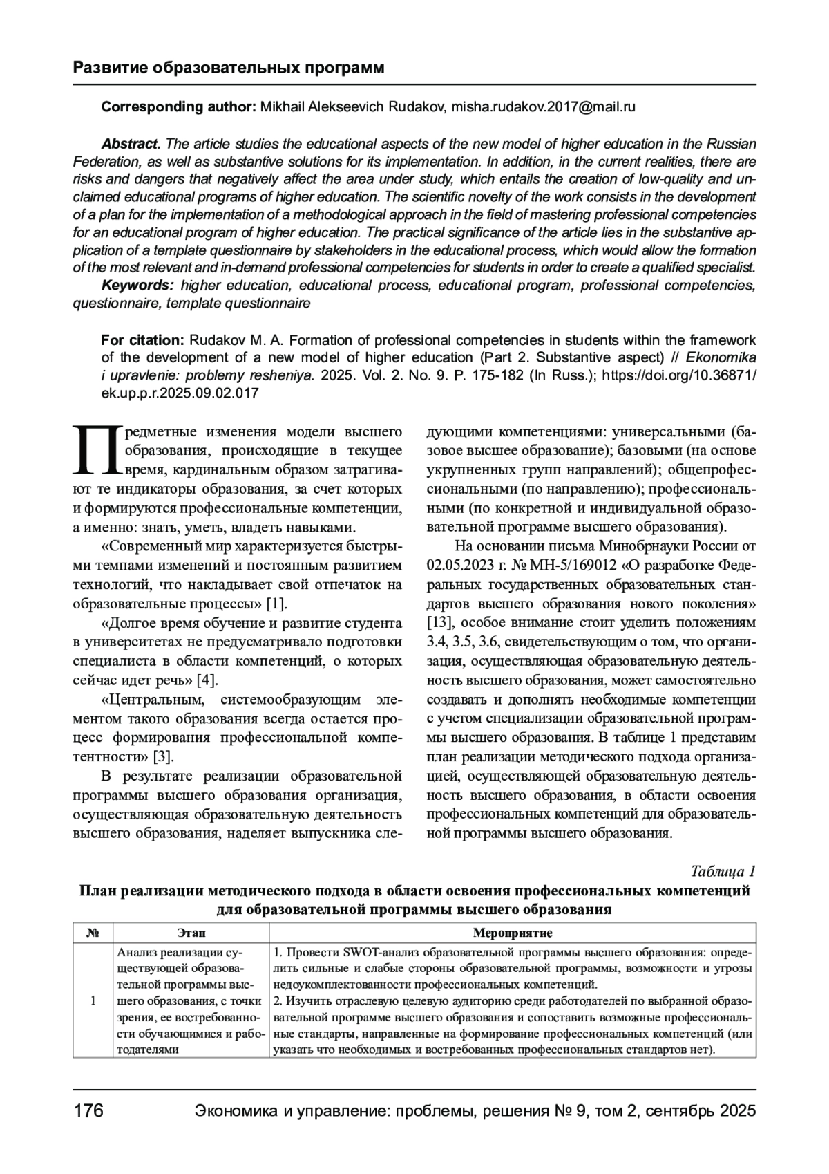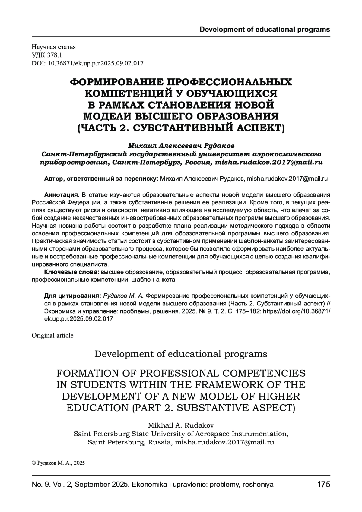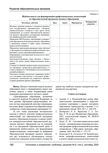 В статье изучаются образовательные аспекты новой модели высшего образования Российской Федерации, а также субстантивные решения ее реализации. Кроме того, в текущих реалиях существуют риски и опасности, негативно влияющие на исследуемую область, что влечет за собой создание некачественных и невостребованных образовательных программ высшего образования. Научная новизна работы состоит в разработке плана реализации методического подхода в области освоения профессиональных компетенций для образовательной программы высшего образования. Практическая значимость статьи состоит в субстантивном применении шаблон-анкеты заинтересованными сторонами образовательного процесса, которое бы позволило сформировать наиболее актуальные и востребованные профессиональные компетенции для обучающихся с целью создания квалифицированного специалиста.