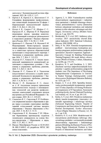 6. Келлер А. В., Суворов Г. Н., Шадрин С. С., Коршунов И. А., Ширкова Н. Н. Передовые инженерные школы: трансфер компетенций и инноваций в интересах регионального и отраслевого развития // Высшее образование в России. 2025. Т. 34, № 2. С. 9-30. EDN: XKJHDO