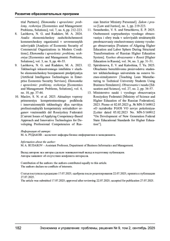 9. Лашкова Н. Г., Рудаков М. А. Технологии искусственного интеллекта в службе экономической безопасности предприятия // Экономика и управление: проблемы, решения. 2023. Т. 4, № 10. С. 37-44. EDN: AVLZAG