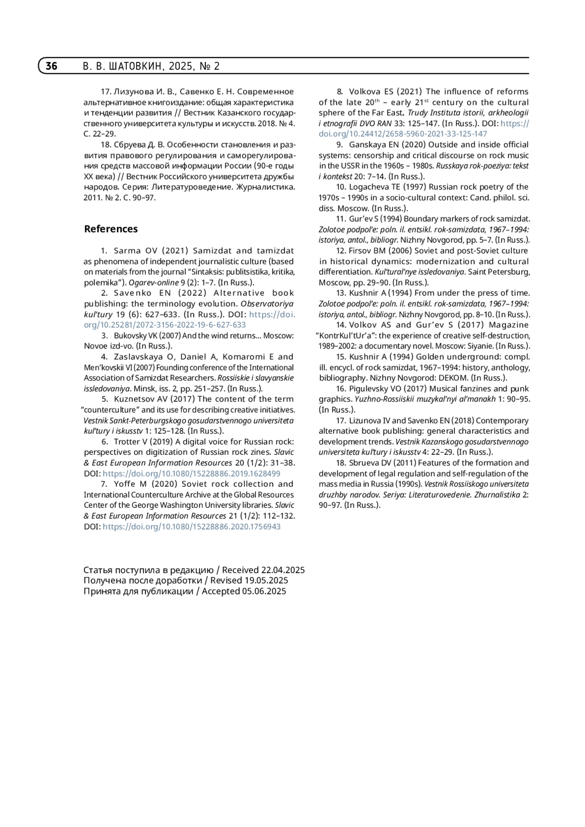 6. Trotter V. A digital voice for Russian rock: perspectives on digitization of Russian rock zines // Slavic & East European Information Resources. 2019. Vol. 20, iss. 1/2. P. 31-38. https://doi.org/10.1080/15228886.2019.1628499