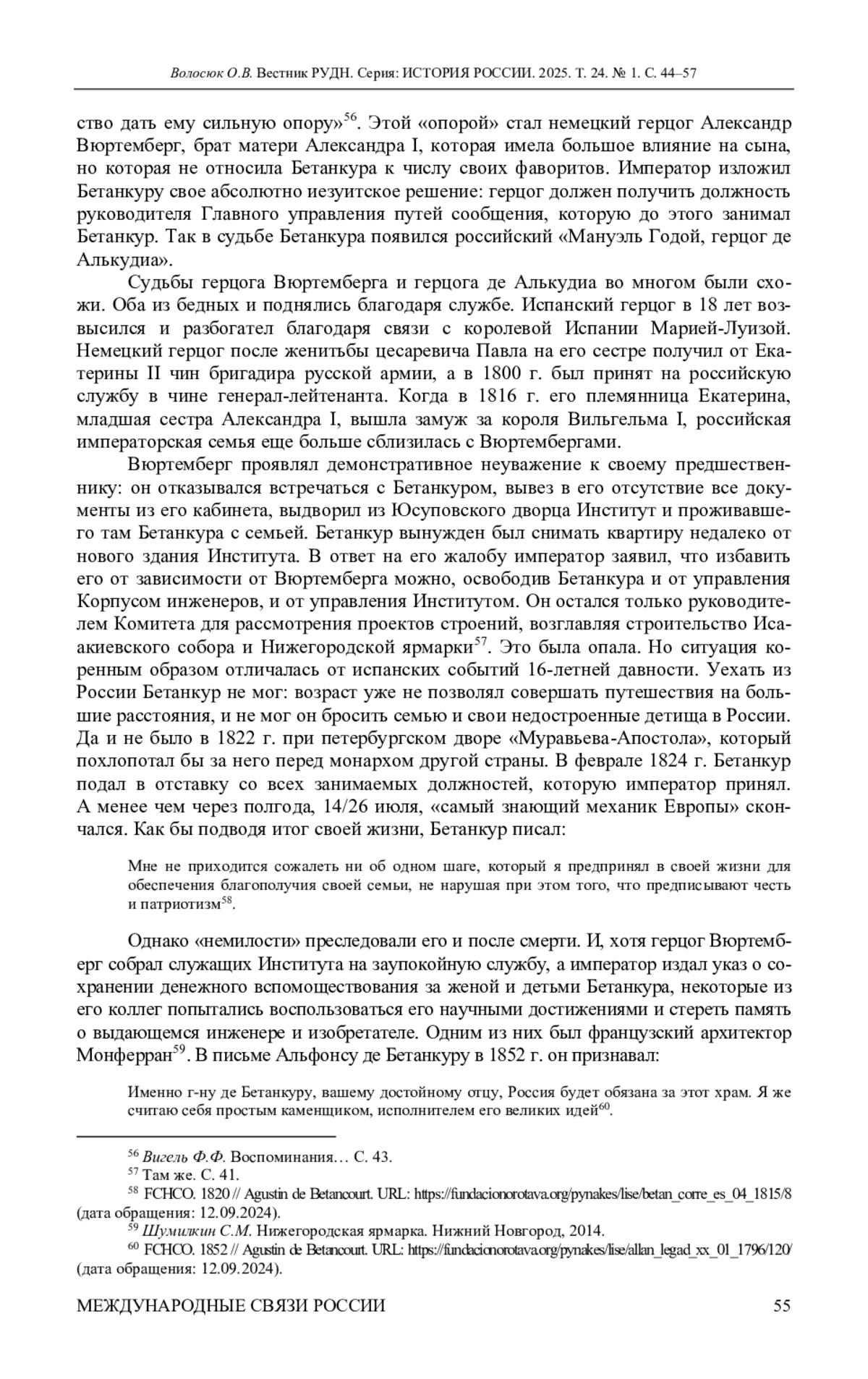 Исследуются основные этапы жизни и деятельности испанского инженера Агустина де Бетанкура, который оказал значительное влияние на развитие инженерного дела в России в начале XIX в. и внес заметный вклад в формирование культурного наследия страны. Особое внимание уделяется малоизученным моментам его биографии: причинам переезда из Испании в Россию и роли в этом российского посланника в Мадриде И. М. Муравьева-Апостола, уточнению некоторых ранее неизвестных деталей его пребывания в Российской империи. На основе документов из российских (АВП РИ, ГА РФ) и испанских архивов (Национального исторического архива, Генерального Архива Индий, Исторического архива дворянства), документов канарского Фонда Оротава, а также мемуарной литературы прослежены особенности отношений Бетанкура с императором Александром I, благосклонное отношение которого обеспечило знаменитому испанцу полный carte-blanche в работе. Автор приходит к выводу, что опала Агустина де Бетанкура привела к «забвению» его вклада в архитектурно-инженерный облик Санкт-Петербурга практически на столетие. Доказывается, что помимо монаршей немилости определенную роль сыграл и французский архитектор Огюст де Монферран, фактически присвоивший себе единоличную славу от совместных работ с испанским инженером.