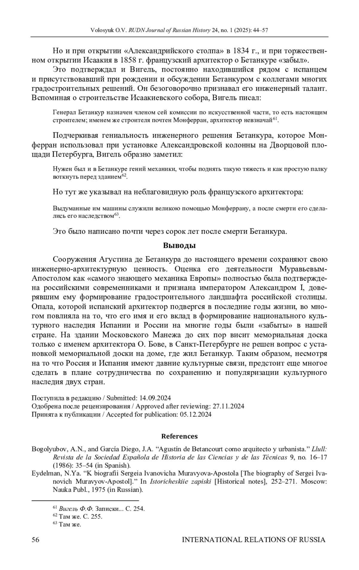 5. Волосюк О.В., Камареро К. Испанцы на русской службе: Агустин де Бетанкур // Испания и Россия: дипломатия и диалог культур. М.: Индрик, 2018. С. 174-182.