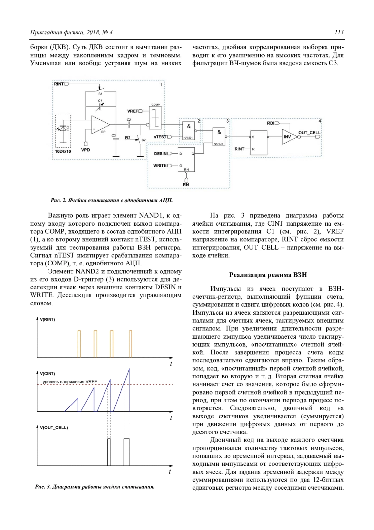 Рассматриваются результаты разработки БИС считывания для сканирующих ИК МФПУ с цифровым режимом ВЗН. Накопление и обработка фотосигнала в цифровом виде на кристалле БИС считывания позволяют повысить отношение сигнал-шум на выходе БИС считывания, а также существенно улучшить весогабаритные характеристики ИК МФПУ. Обосновывается целесообразность реализации цифрового режима ВЗН по конвейерной архитектуре, являющейся цифровым аналогом приборов с зарядовой связью. Отмечены преимущества конвейерной архитектуры: меньший шаг следования каналов в сочетании с пониженной потребляемой мощностью. Приводятся результаты тестирования первой отечественной БИС считывания с цифровым режимом ВЗН формата 102410 и с шагом каналов 15 мкм, получены выходные цифровые сигналы в формате 12-битного последовательного кода.
