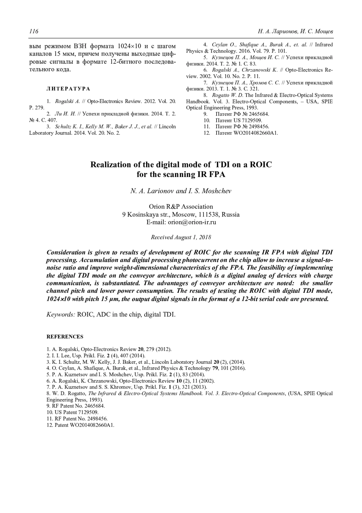N. A. Larionov and I. S. Moshchev Realization of the digital mode of TDI on a ROIC for the scanning IR FPA 111