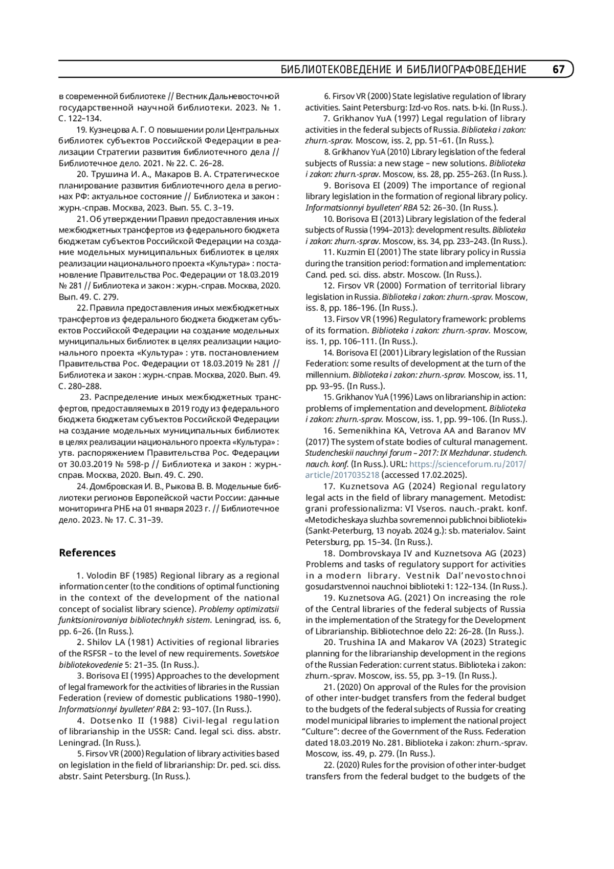 20. Трушина И. А., Макаров В. А. Стратегическое планирование развития библиотечного дела в регионах РФ: актуальное состояние // Библиотека и закон : журн.-справ. Москва, 2023. Вып. 55. С. 3-19.