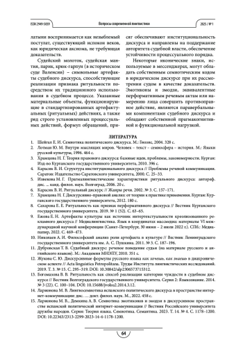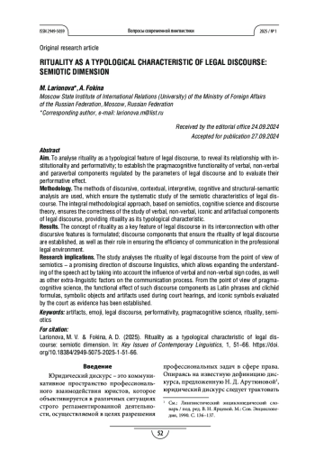 Процедуры и методы. Системность исследования семиотических характеристик юридического дискурса достигается за счёт использования методов дискурсивного, контекстуального, интерпретативного, когнитивного и структурно-семантического анализа. Интегральный методический подход, опирающийся на семиотику, когнитивистику и теорию дискурса, гарантирует корректность исследования вербальных, невербальных, иконических и артефактуальных компонентов юридического дискурса, обеспечивающих ритуальность как его типологическую характеристику.