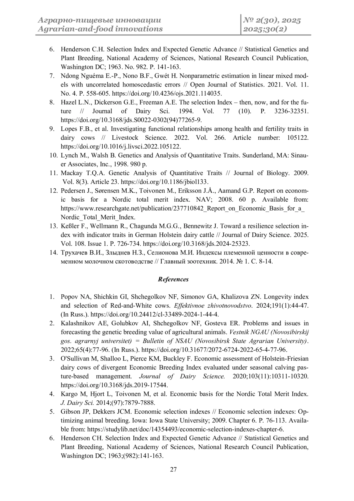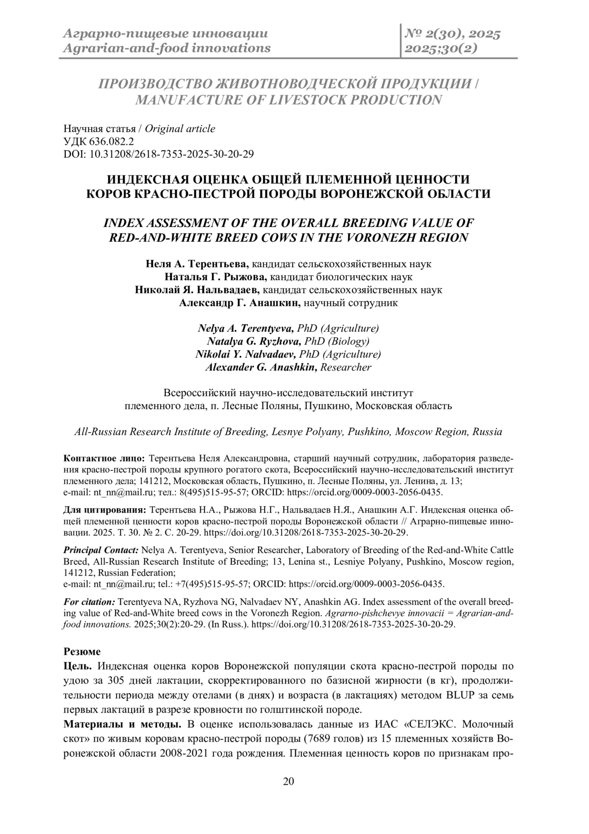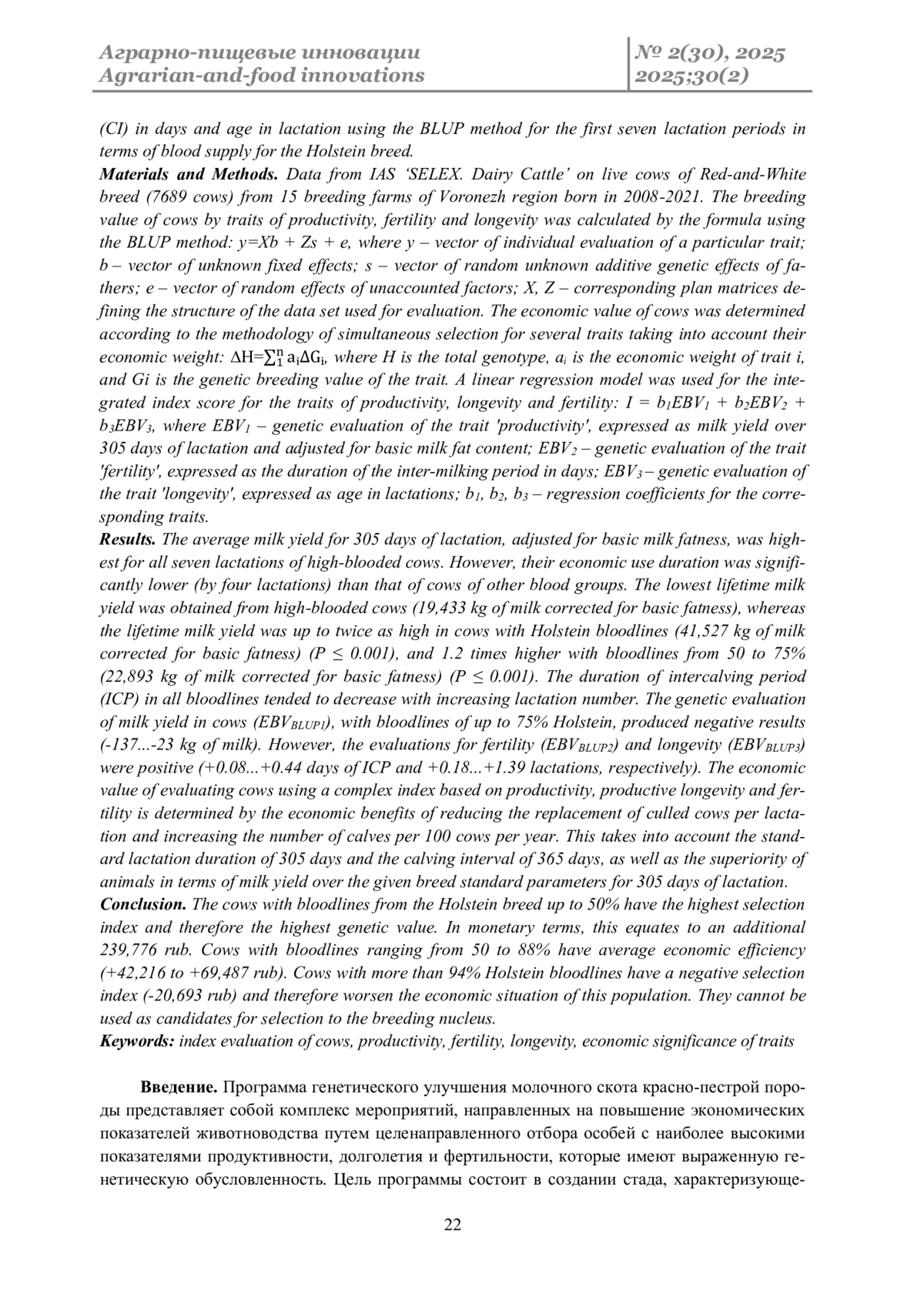 Материалы и методы. В оценке использовалась данные из ИАС «СЕЛЭКС. Молочный скот» по живым коровам красно-пестрой породы (7689 голов) из 15 племенных хозяйств Воронежской области 2008-2021 года рождения. Племенная ценность коров по признакам продуктивности, фертильности и долголетия рассчитывалась по формуле с использованием метода BLUP: y=Xb + Zs + e, где y - вектор индивидуальной оценки конкретного признака; b - вектор неизвестных фиксированных эффектов; s - вектор случайных неизвестных аддитивных генетических эффектов отцов; e - вектор случайных эффектов неучтенных факторов; X, Z - соответствующие матрицы плана, определяющие структуру набора данных, который используется для оценки. Экономическую ценность коров определяли по методике одновременного отбора по нескольким признакам с учетом их экономического веса: ∆Н=1naᵢ∆Gᵢ, где Н - совокупный генотип, aᵢ - экономический веc признака i, и Gi - генетическая племенная ценность признака. Для комплексной индексной оценки по признакам продуктивности, долголетию и фертильности использовалась линейно-регрессионная модель: I = b1EBV1 + b2EBV2 + b3EBV3, где EBV1 - генетическая оценка признака «продуктивность», выраженная в удое за 305 дней лактации, скорректированном на базисную жирность молока; EBV2 - генетическая оценка признака «фертильность», выраженного в продолжительности межотельного периода в днях; EBV3 - генетическая оценка признака «долголетие», выраженного в возрасте в лактациях; b1, b2, b3 - коэффициенты регрессии для соответствующих признаков.
