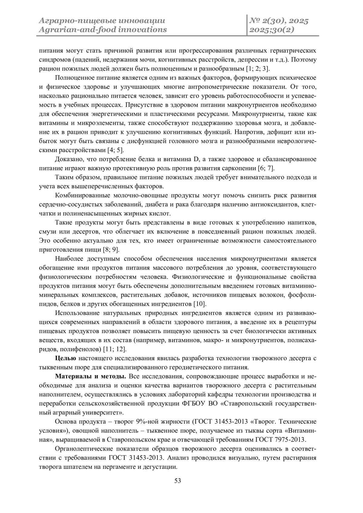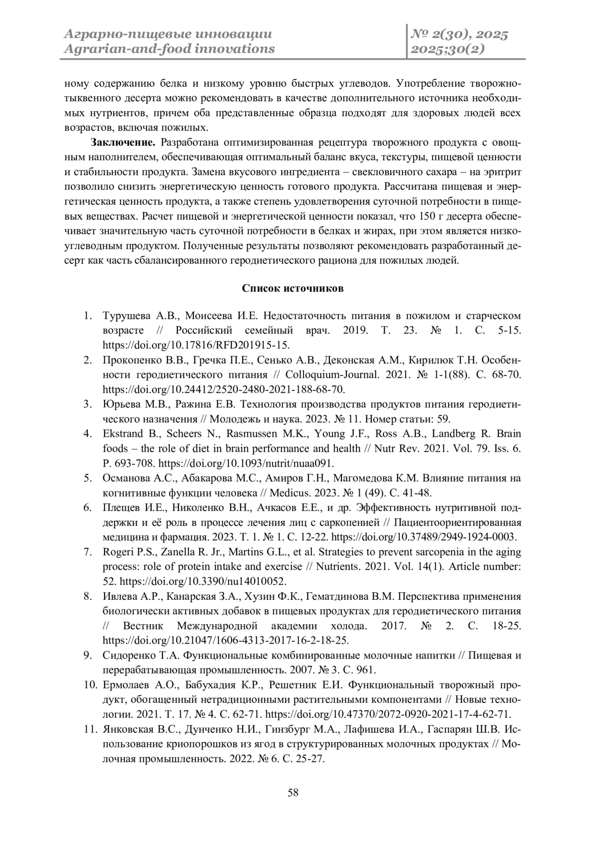 Заключение. Рецептура обеспечивает не только приятный вкус и текстуру, но и способствует достижению поставленных целей в области питания. Полученные результаты позволяют рекомендовать разработанный десерт как часть сбалансированного геродиетического рациона для пожилых людей.