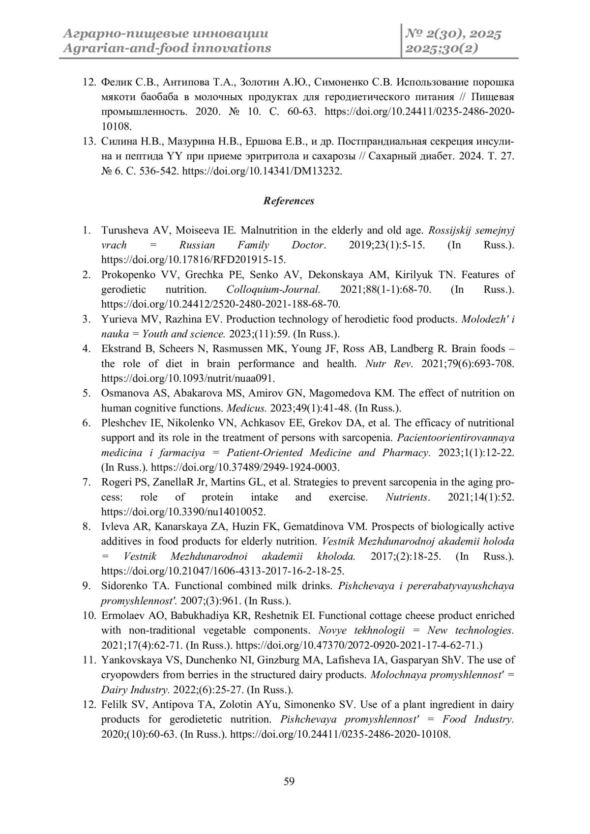 12. Фелик С.В., Антипова Т.А., Золотин А.Ю., Симоненко С.В. Использование порошка мякоти баобаба в молочных продуктах для геродиетического питания // Пищевая промышленность. 2020. № 10. С. 60-63. DOI: 10.24411/0235-2486-2020-10108