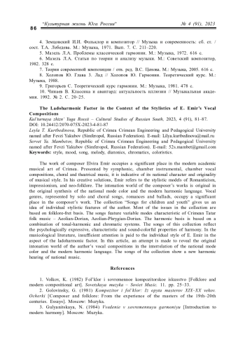 В музыковедческой литературе недостаточное внимание уделено индивидуальному стилю Э. Эмир в аспекте ладогармонического фактора. В настоящей статье предпринята попытка раскрыть самобытный интонационный мир вокальных сочинений автора во взаимосвязи национального ладового колорита и современного гармонического языка