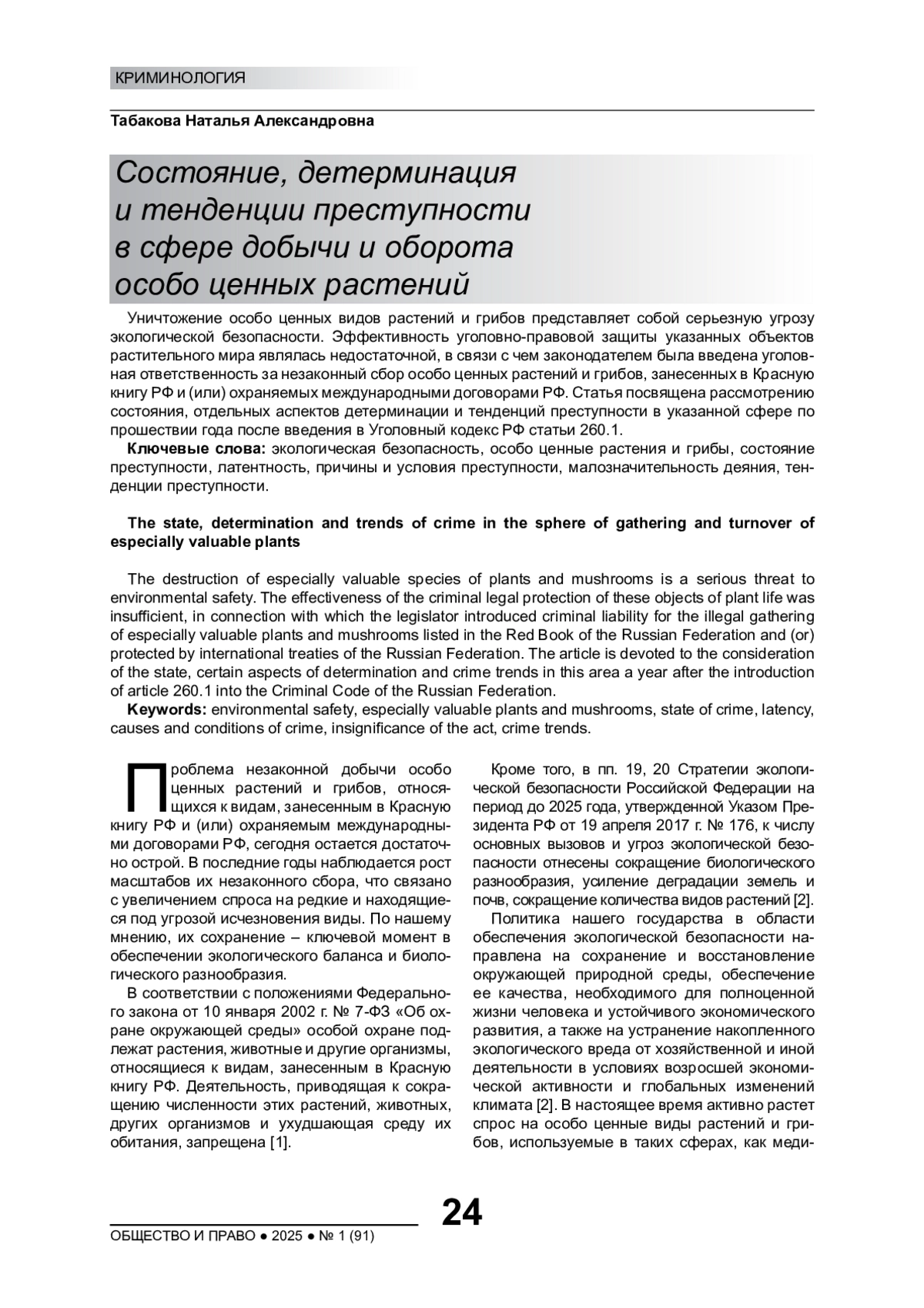 Уничтожение особо ценных видов растений и грибов представляет собой серьезную угрозу экологической безопасности. Эффективность уголовно-правовой защиты указанных объектов растительного мира являлась недостаточной, в связи с чем законодателем была введена уголовная ответственность за незаконный сбор особо ценных растений и грибов, занесенных в Красную книгу РФ и (или) охраняемых международными договорами РФ. Статья посвящена рассмотрению состояния, отдельных аспектов детерминации и тенденций преступности в указанной сфере по прошествии года после введения в Уголовный кодекс РФ статьи 260.1