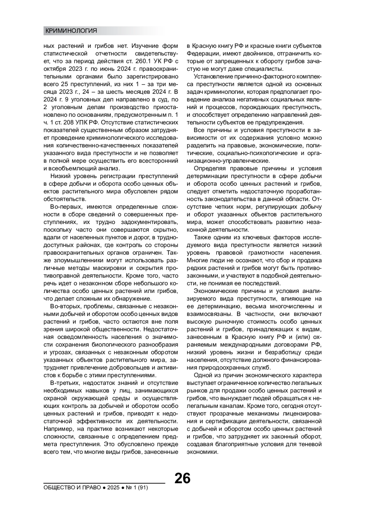 Проблема незаконной добычи особо ценных растений и грибов, относящихся к видам, занесенным в Красную книгу РФ и (или) охраняемым международными договорами РФ, сегодня остается достаточно острой. В последние годы наблюдается рост масштабов их незаконного сбора, что связано с увеличением спроса на редкие и находящиеся под угрозой исчезновения виды. По нашему мнению, их сохранение – ключевой момент в обеспечении экологического баланса и биологического разнообразия