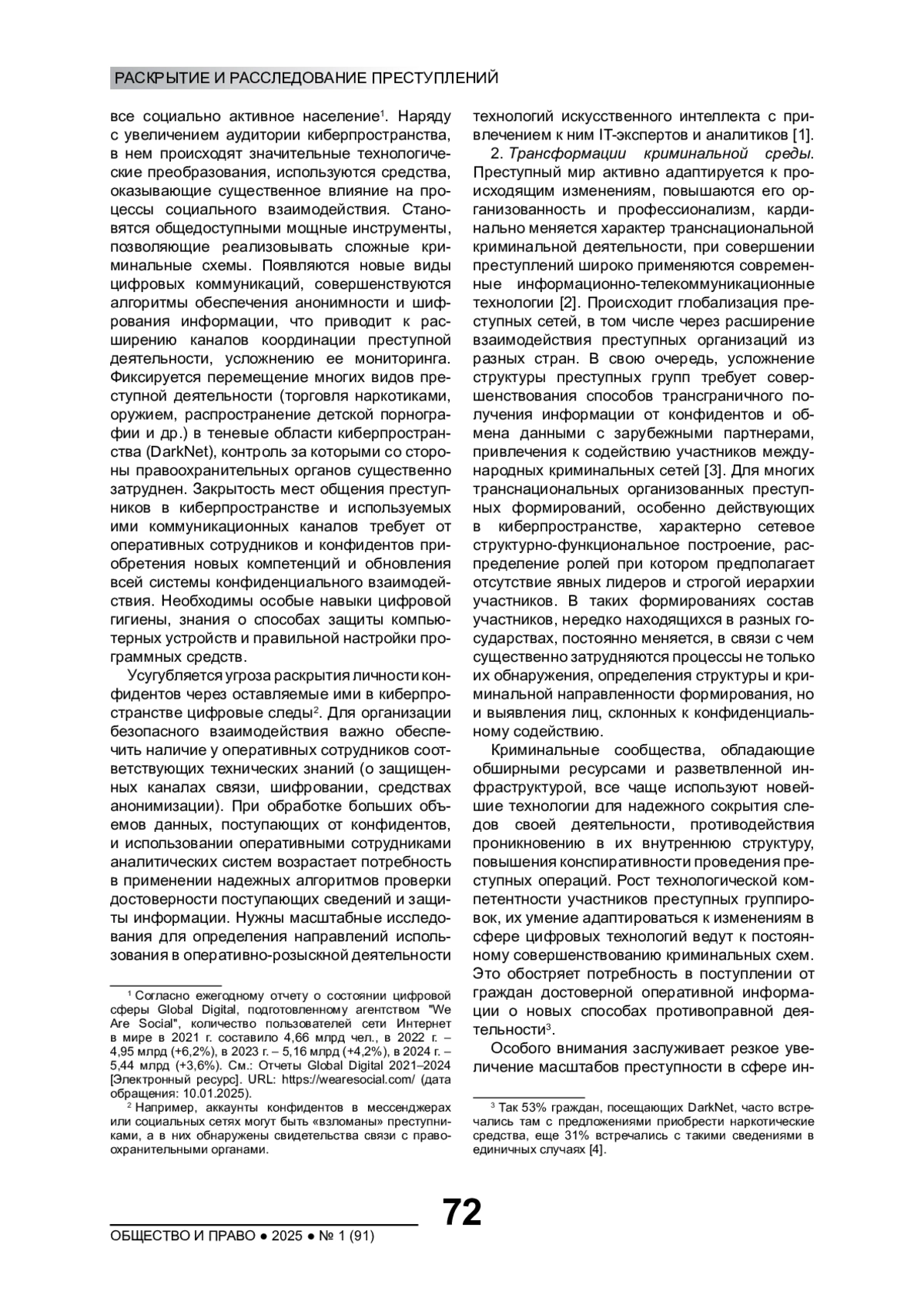 В последние годы особый комплекс вызовов и угроз безопасности России обусловлен существенным обновлением социальной реальности, связанным со сложными политическими процессами, формированием новой многополярной системы миропорядка, резким обострением противостояния недружественным государствам, информатизацией всех сфер функционирования общества, глубоким преобразованием глобальной экономики на основе ее масштабной цифровизации. Среди наиболее значимых угроз все более проблемным становится противодействие криминальной среде, кардинально меняющей свои базовые характеристики