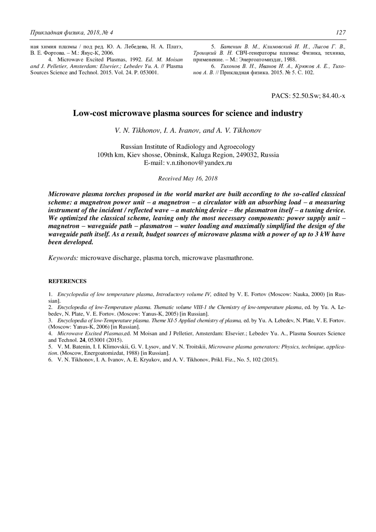 Статья: Недорогие СВЧ-плазмотроны для науки и промышленности (2018)