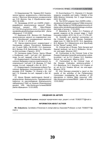 15. Кувырченкова Т.В., Черевко В.В. Генетическое оружие: возможность и действительность // Вестник Московского университета им. С.Ю. Витте. Сер. 2: Юридические науки. 2023. № 2(38). EDN: EGEPYR