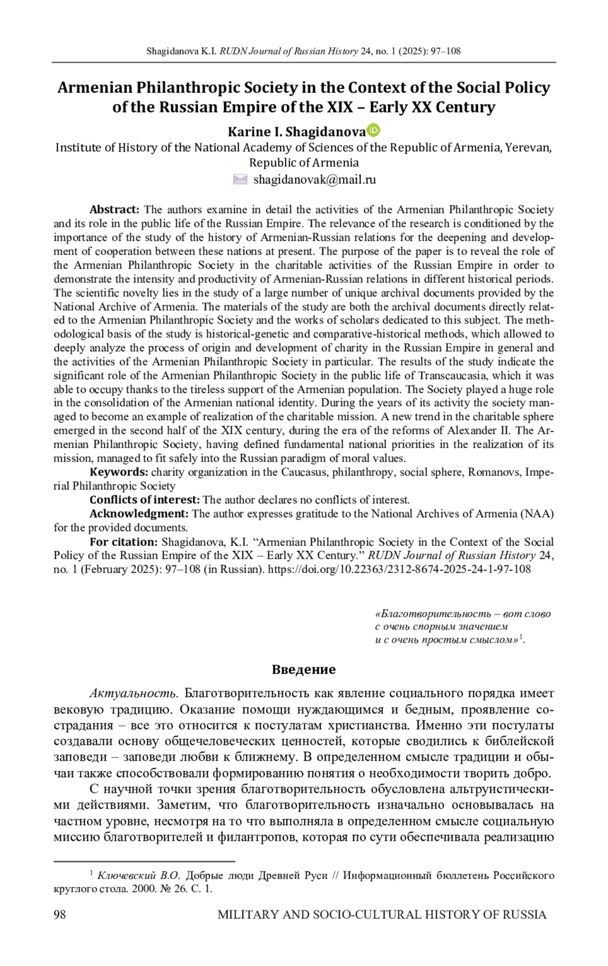 Целью является выявление роли Армянского человеколюбивого общества в благотворительной деятельности Российской империи для того, чтобы продемонстрировать интенсивность и продуктивность армяно-российских отношений в разные исторические эпохи. Научная новизна заключается в исследовании большого количества уникальных архивных документов, выявленных автором в Национальном архиве Армении. Методологической основой являются историко-генетический и сравнительно-исторический методы, которые позволили глубоко проанализировать процесс зарождения и развития благотворительности в Российской империи в целом и деятельность Армянского человеколюбивого общества в частности.