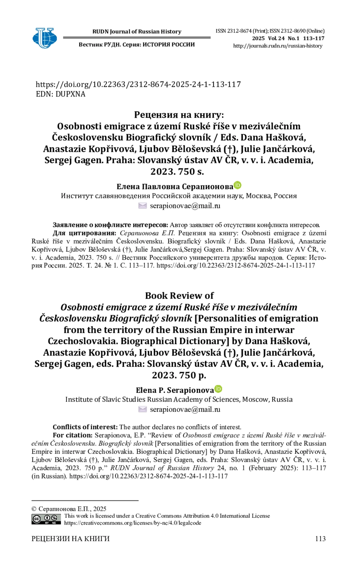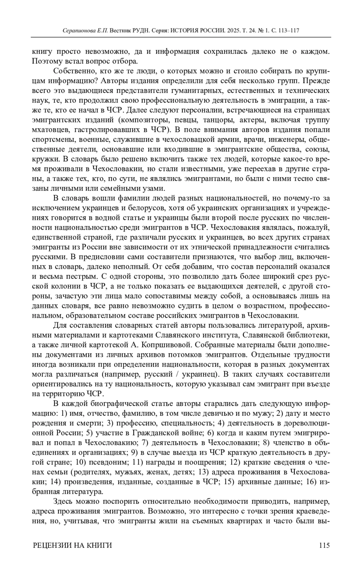 Для цитирования: Серапионова Е. П. Рецензия на книгу: Osobnosti emigrace z území Ruské říše v meziválečním Československu. Biografický slovník / Eds. Dana Hašková, Anastazie Kopřivová, Ljubov Běloševská (†), Julie Jančárková, Sergej Gagen. Praha: Slovanský ústav AV ČR, v. v. i. Academia, 2023. 750 s. // Вестник Российского университета дружбы народов. Серия: История России. 2025. Т. 24. № 1. С. 113–117. https://doi. org/10.22363/2312-8674-2025-24-1-113-117