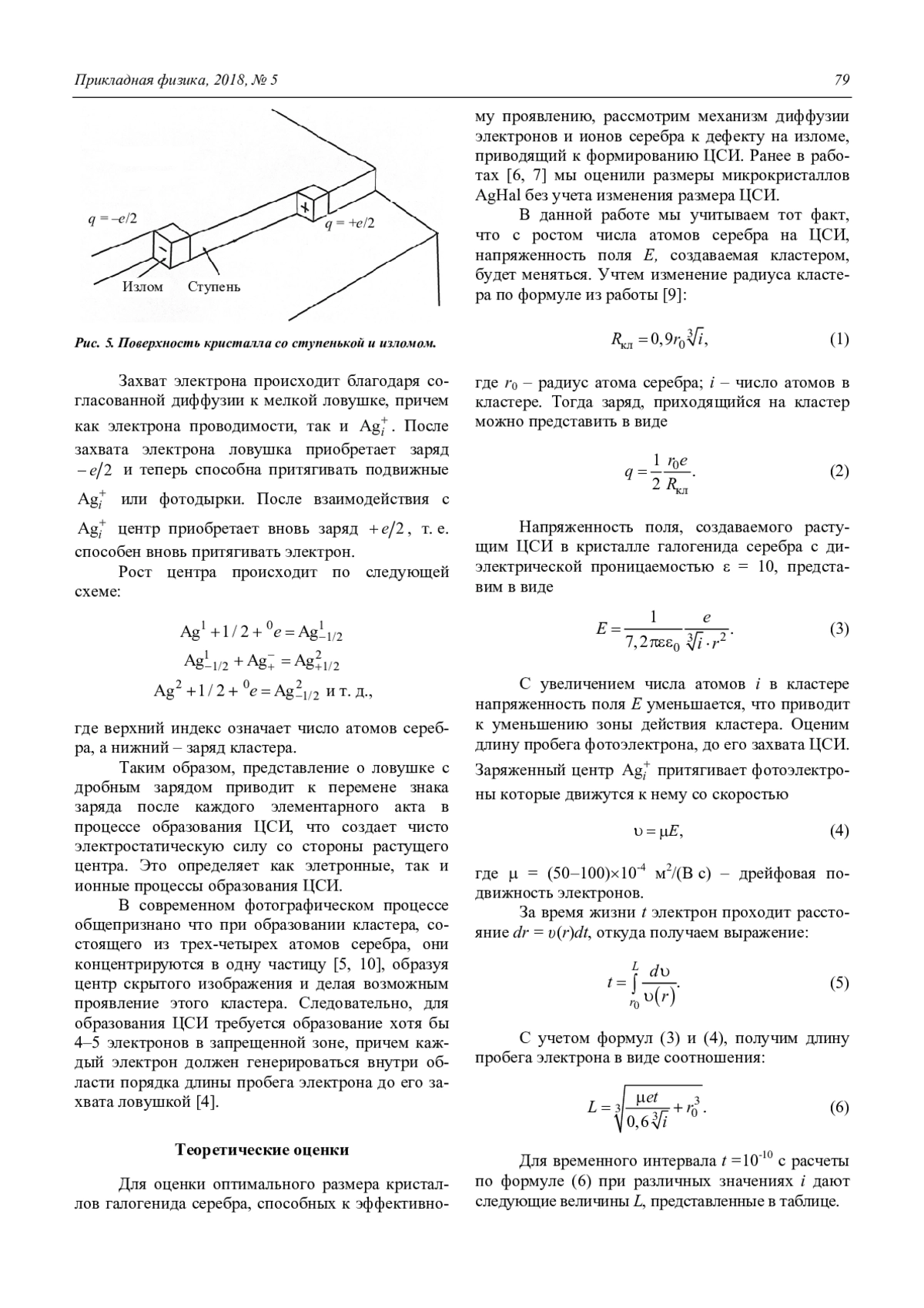 Рассмотрен метод синтеза плоских нанокристаллов галогенида серебра на желатиновой матрице методом двухструйной эмульсификации. Полученные кристаллы изучались с помощью атомно-силового микроскопа и оптического микроскопа Velomet. Формирование центров скрытого изображения на кристаллах галогенида серебра связано с наличием дефектов, на которых скапливаются ионы серебра, образуя кластеры. Учтен факт, изменения напряжённости электрического поля кластера с увеличением числа атомов серебра в кластере. Приведены теоретические расчеты длины пробега фотоэлектронов до их захвата центрами скрытого изображения. Сделан вывод о том, что эмульсионные нанокристаллы, размеры которых достигают 25–50 нм, являются наиболее оптимальными с точки зрения светочувствительности и разрешающей способности.