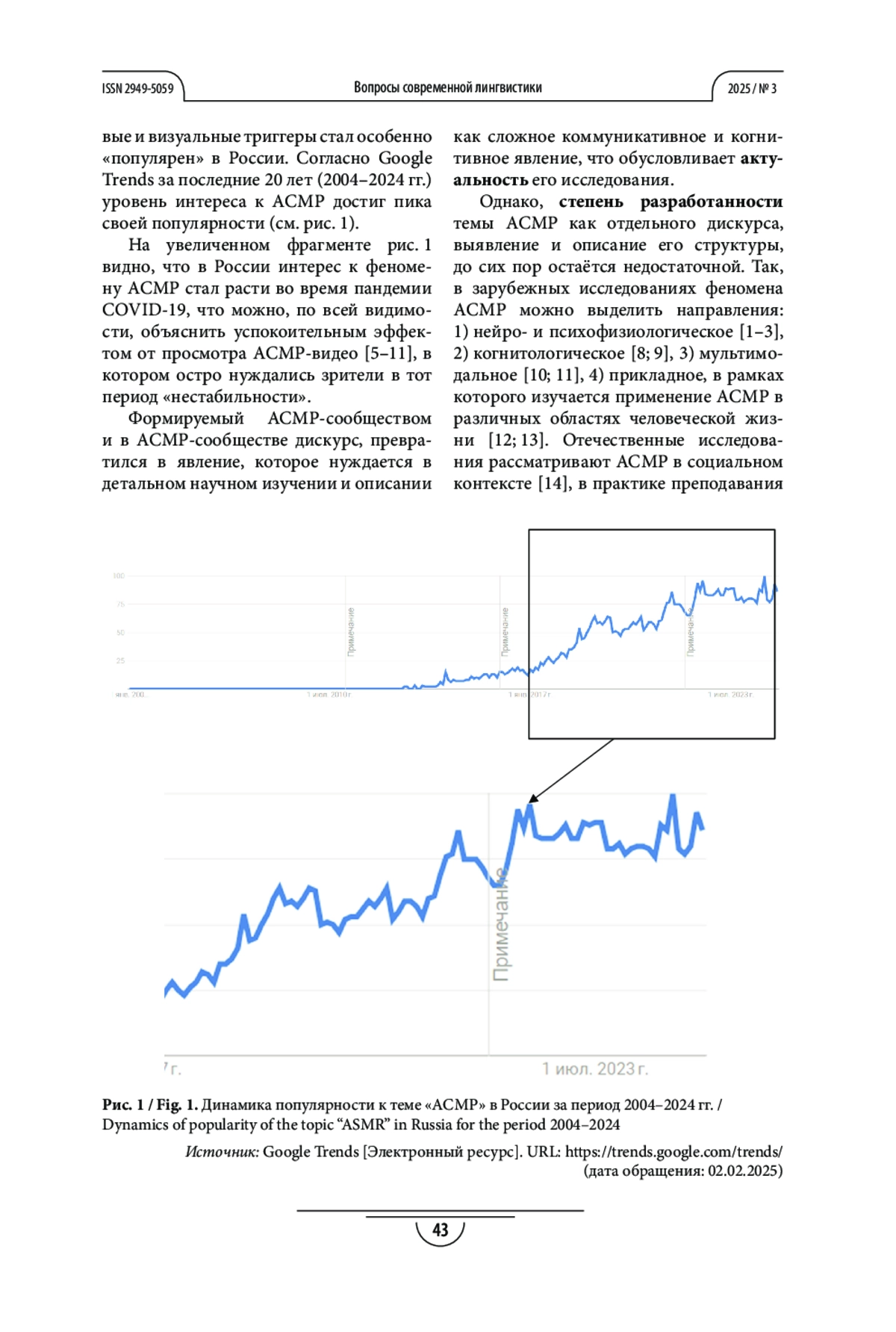 4. Евграфова Ю.А. Основные особенности АСМР-дискурса (на материале сюжетных видеотекстов) // Вопросы современной лингвистики. 2024. № 4. С.28-39. DOI: 10.18384/2949-5075-2024-4-28-39