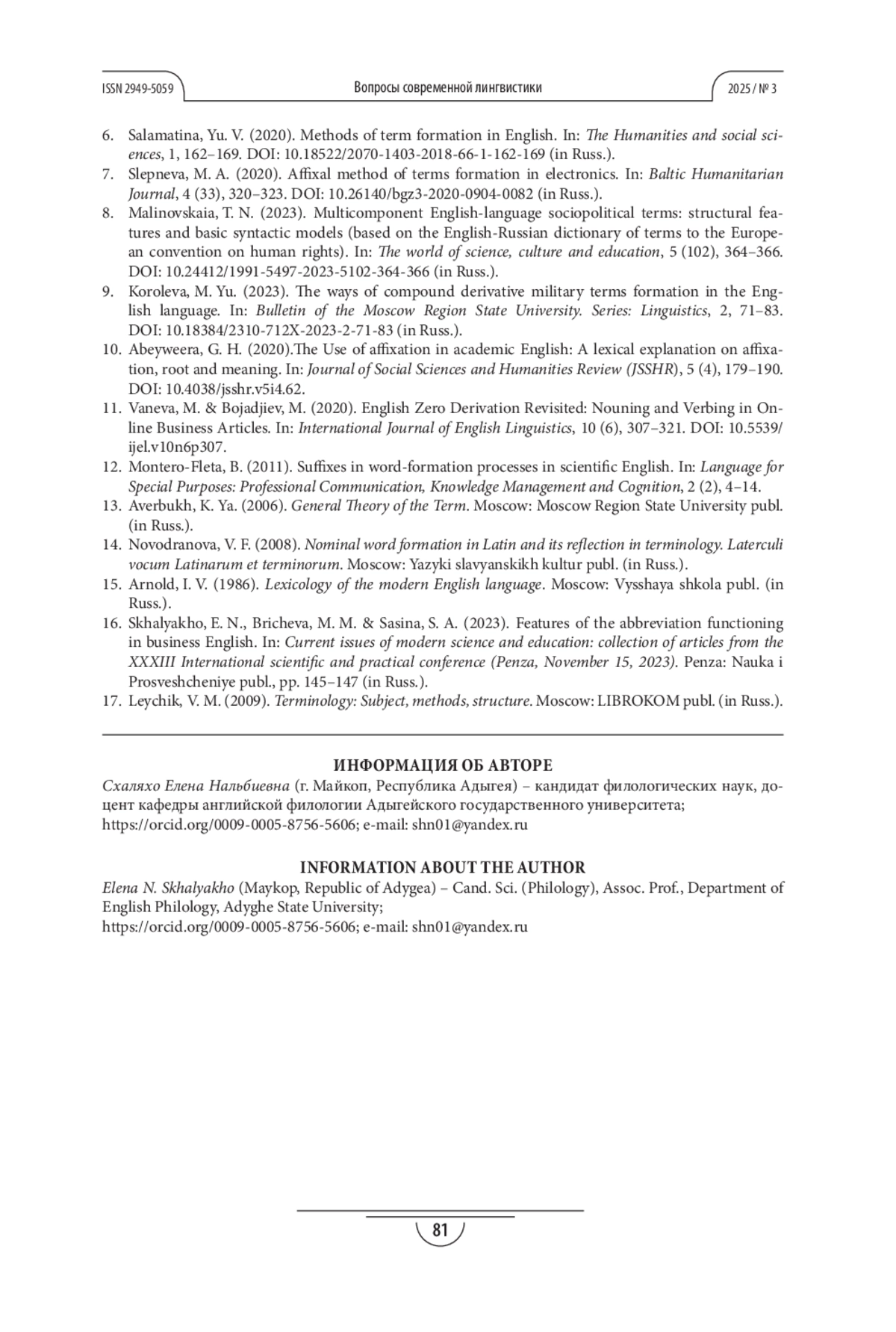6. Саламатина Ю.В. Способы терминообразования в английском языке // Гуманитарные и социальные науки. 2020. № 1. С.162-169. DOI: 10.18522/2070-1403-2018-66-1-162-169 EDN: SCPJYX