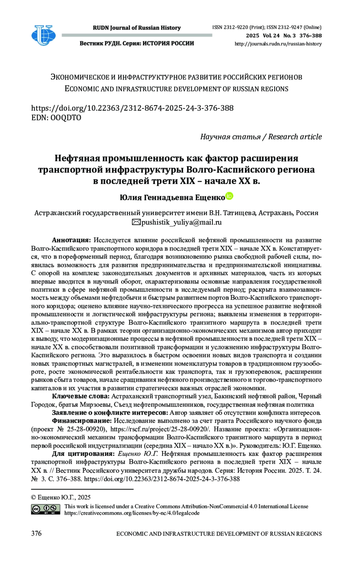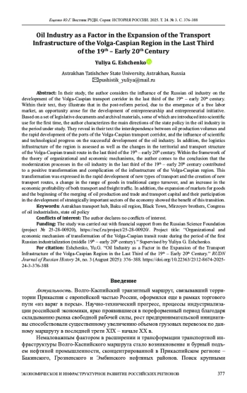 Исследуется влияние российской нефтяной промышленности на развитие Волго-Каспийского транспортного коридора в последней трети XIX - начале XX в. Констатируется, что в пореформенный период, благодаря возникновению рынка свободной рабочей силы, появилась возможность для развития предпринимательства и предпринимательской инициативы. С опорой на комплекс законодательных документов и архивных материалов, часть из которых впервые вводится в научный оборот, охарактеризованы основные направления государственной политики в сфере нефтяной промышленности в исследуемый период; раскрыта взаимозависимость между объемами нефтедобычи и быстрым развитием портов Волго-Каспийского транспортного коридора; оценено влияние научно-технического прогресса на успешное развитие нефтяной промышленности и логистической инфраструктуры региона; выявлены изменения в территориально-транспортной структуре Волго-Каспийского транзитного маршрута в последней трети XIX - начале ХХ в. В рамках теории организационно-экономических механизмов автор приходит к выводу, что модернизационные процессы в нефтяной промышленности в последней трети XIX - начале ХХ в. способствовали позитивной трансформации и усложнению инфраструктуры Волго-Каспийского региона. Это выразилось в быстром освоении новых видов транспорта и создании новых транспортных магистралей, в изменении номенклатуры товаров в традиционном грузообороте, росте экономической рентабельности как транспорта, так и грузоперевозок, расширении рынков сбыта товаров, начале сращивания нефтяного производственного и торгово-транспортного капиталов и их участия в развитии стратегически важных отраслей экономики.