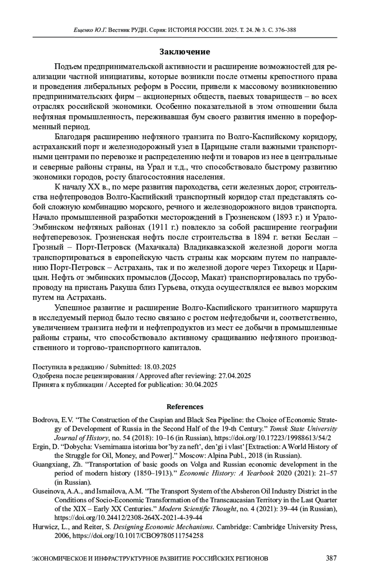 1. Бодрова Е.В. Строительство Каспийско-Черноморского трубопровода: выбор экономической стратегии развития России во второй половине XIX в. // Вестник Томского государственного университета. История. 2018. № 54. С. 10-16. ;. DOI: 10.17223/19988613/54/2 EDN: XYTROP