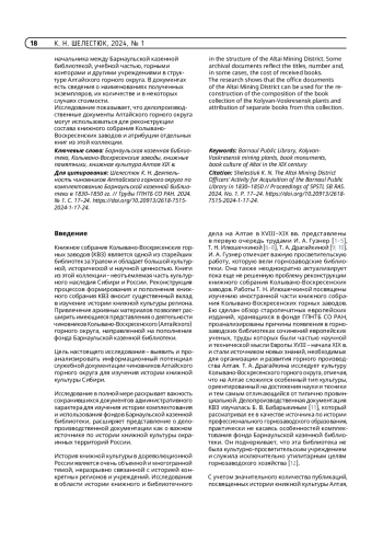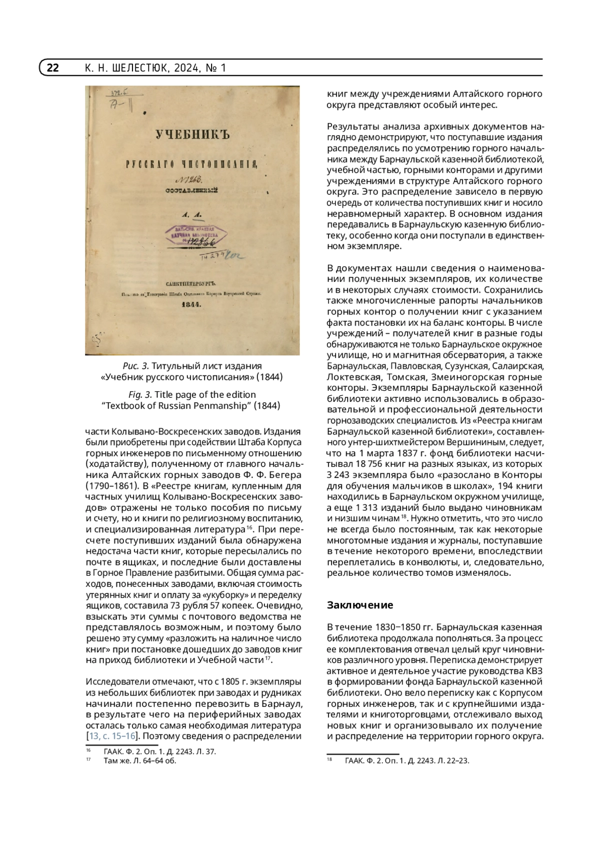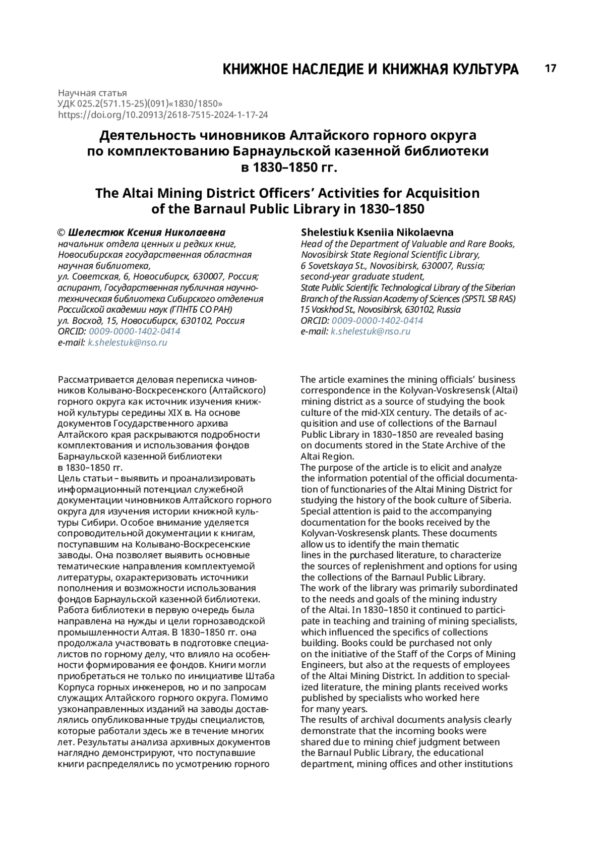 ШЕЛЕСТЮК К. Н. ДЕЯТЕЛЬНОСТЬ ЧИНОВНИКОВ АЛТАЙСКОГО ГОРНОГО ОКРУГА ПО КОМПЛЕКТОВАНИЮ БАРНАУЛЬСКОЙ КАЗЕННОЙ БИБЛИОТЕКИ В 1830–1850 ГГ. // ТРУДЫ ГПНТБ СО РАН. 2024. № 1