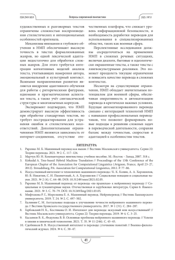 6. Мифтахова Р. Г., Морозкина Е. А. Машинный перевод. Нейроперевод // Вестник Башкирского университета. 2019. Т. 24. № 2. С. 497-502. EDN: VWVCPH