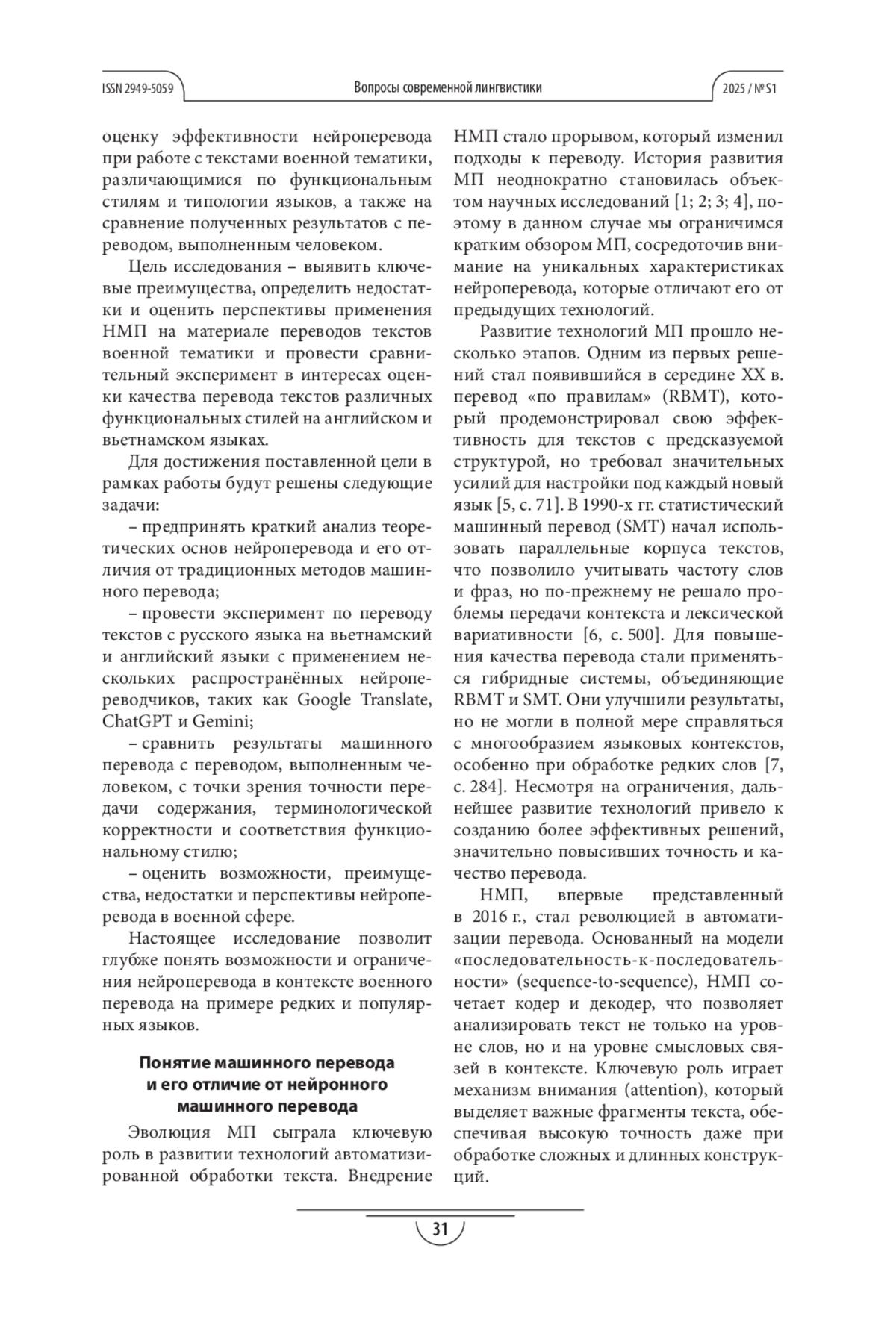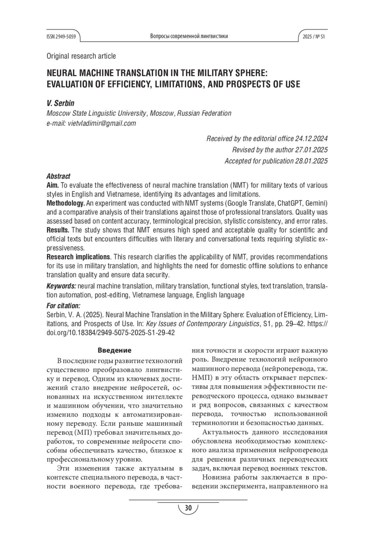 Цель исследования - оценить эффективность нейронного машинного перевода (НМП) для военных текстов различных стилей на английском и вьетнамском языках, выявить преимущества и ограничения технологии.