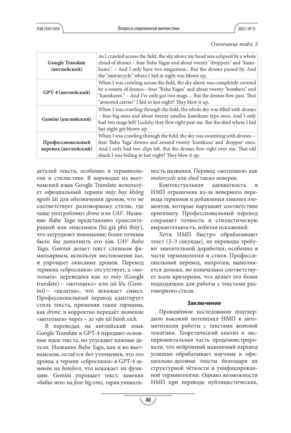 Процедура и методы. Методы включают эксперимент с НМП-системами (Google Translate, ChatGPT, Gemini) и сравнительный анализ их переводов с работами профессиональных переводчиков. Качество оценивалось по точности содержания, терминологической корректности, стилистическому соответствию и уровню ошибок.