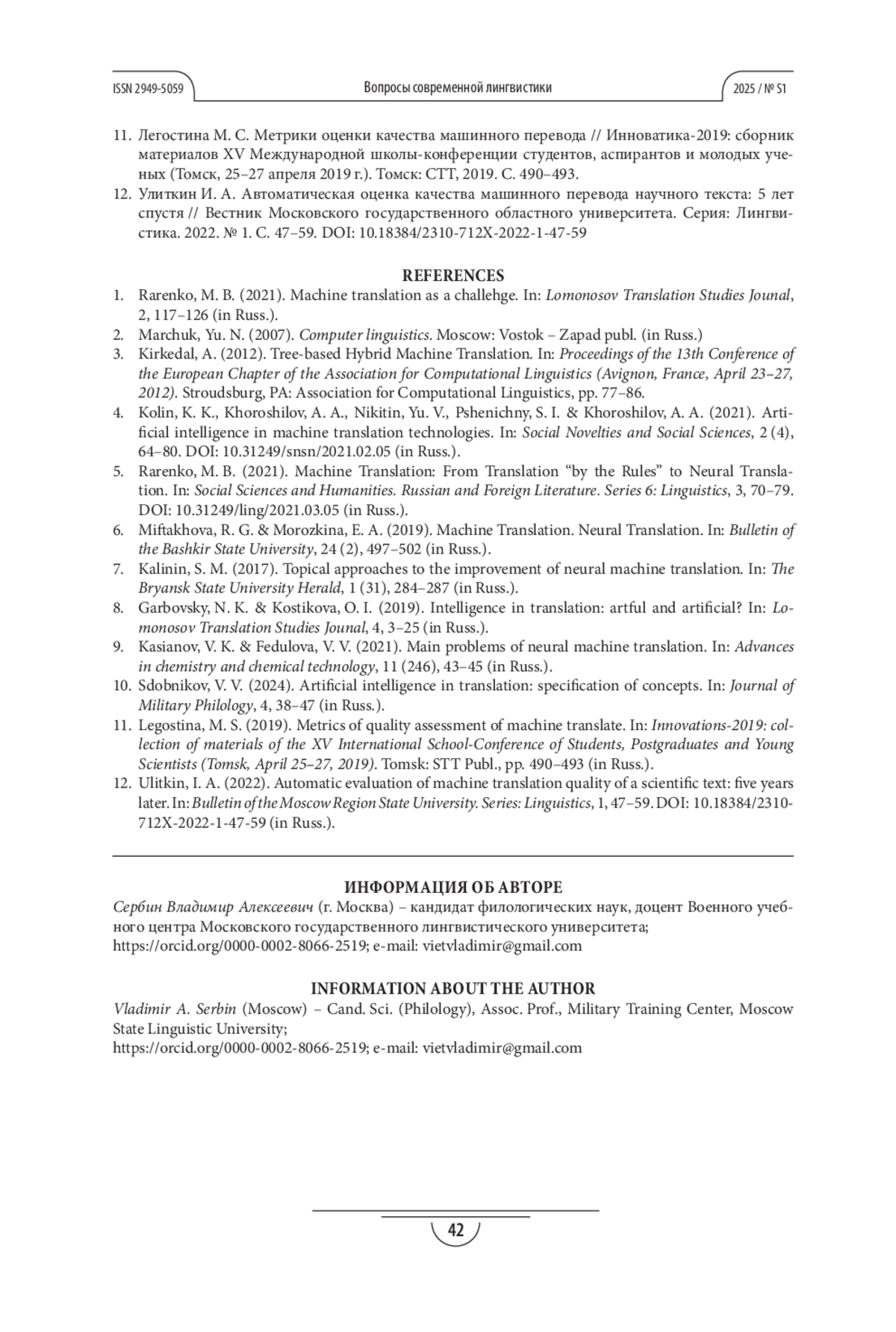 12. Улиткин И. А. Автоматическая оценка качества машинного перевода научного текста: 5 лет спустя // Вестник Московского государственного областного университета. Серия: Лингвистика. 2022. № 1. С. 47-59. DOI: 10.18384/2310-712X-2022-1-47-59 EDN: GTAUUM