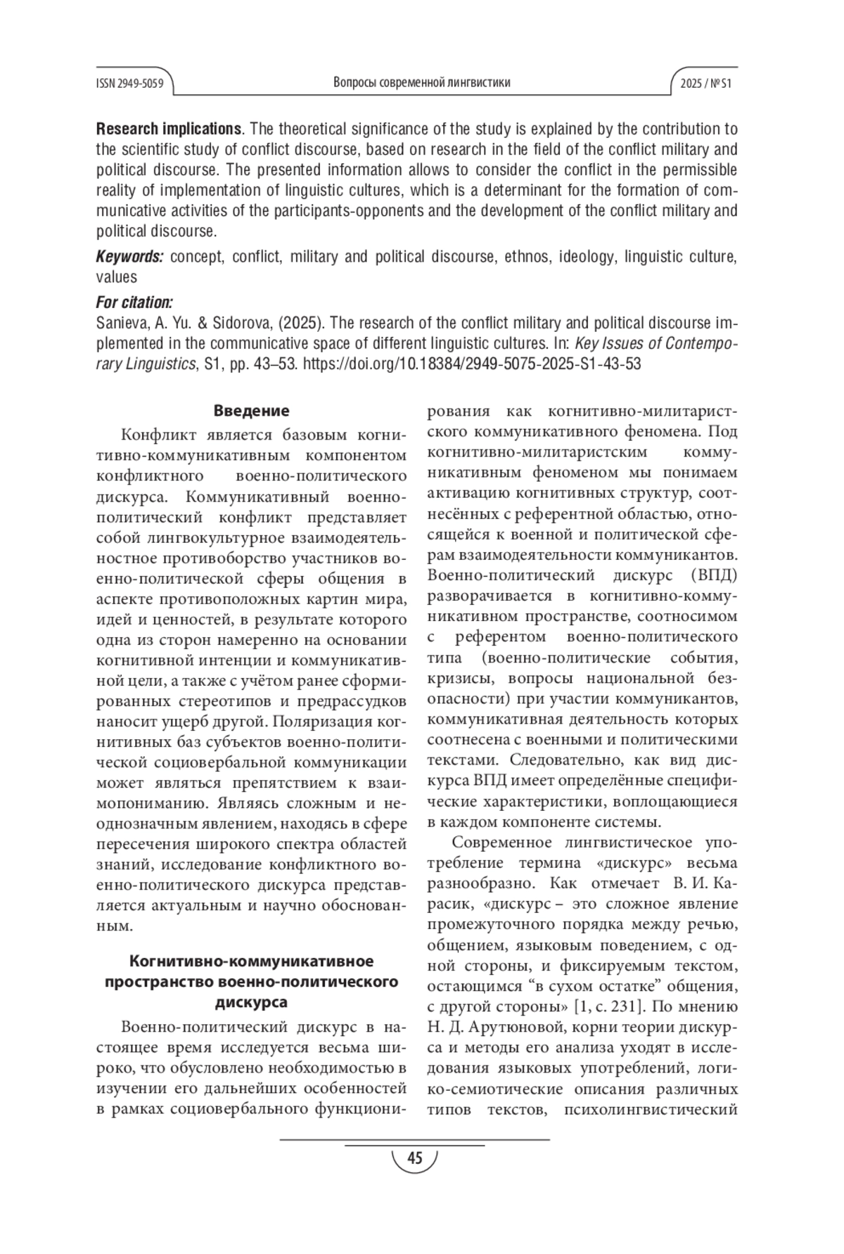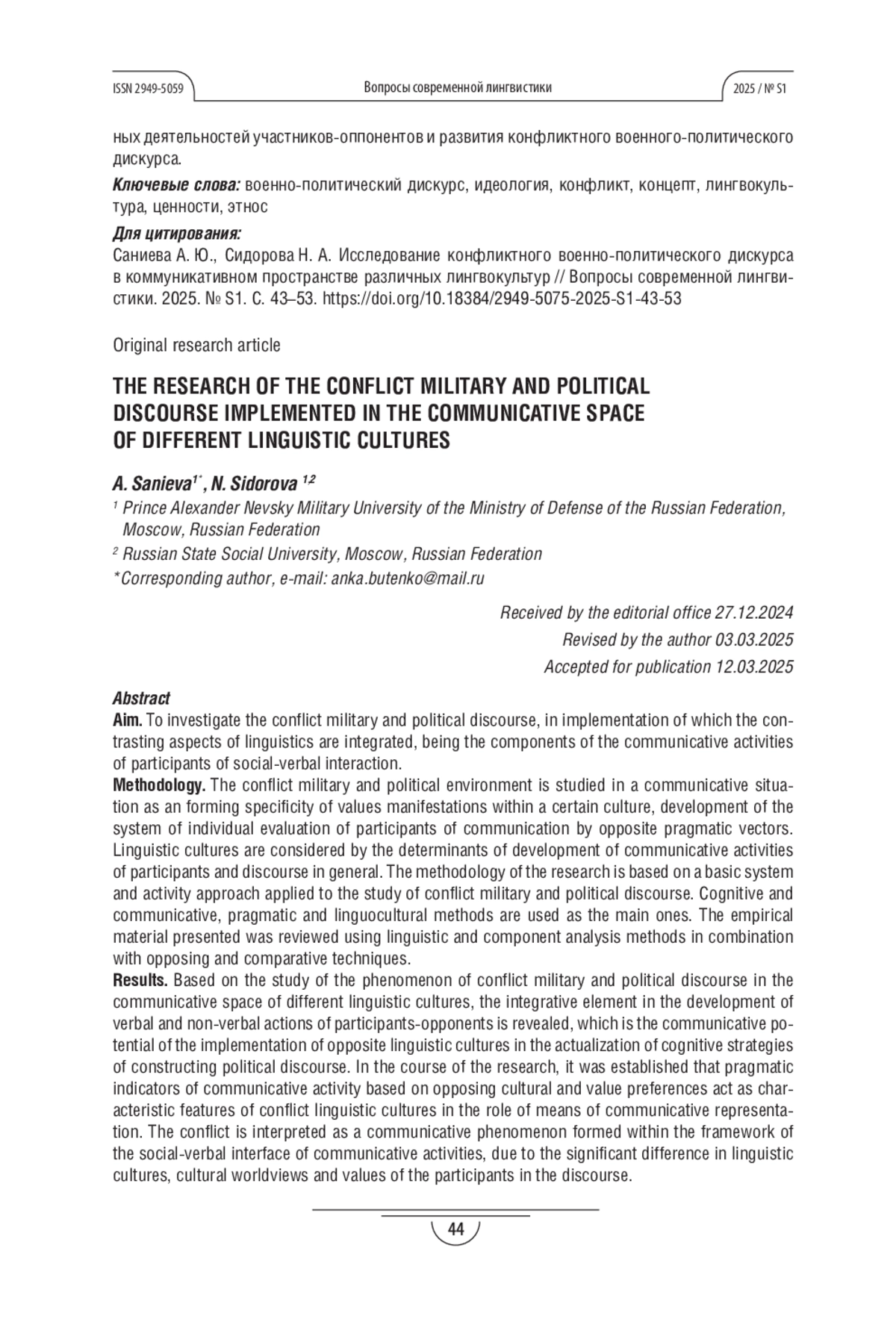 Цель работы заключается в исследовании конфликтного военно-политического дискурса, при реализации которого интегрируются контрастные аспекты лингвокультур, являющихся компонентами коммуникативных деятельностей участников социовербального взаимодействия.