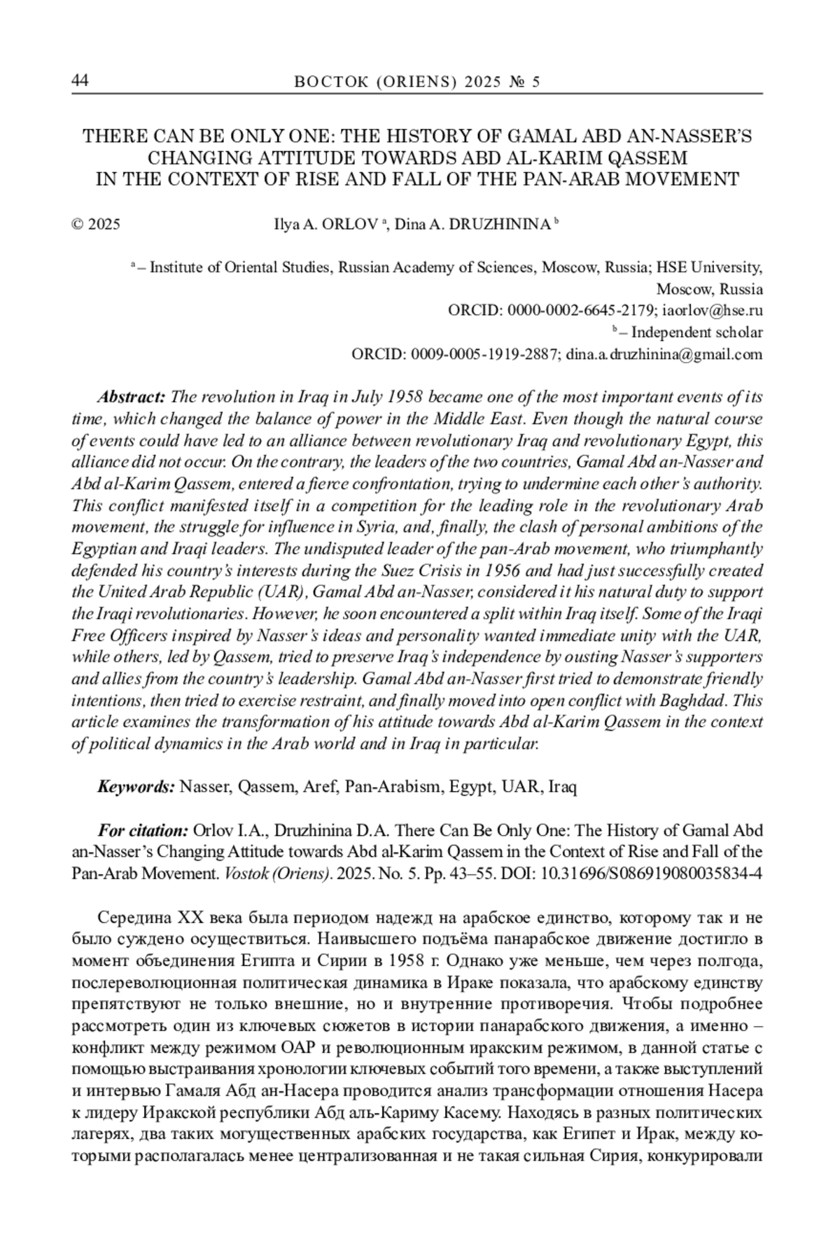 ОРЛОВ И. А., ДРУЖИНИНА Д. А. ДОЛЖЕН ОСТАТЬСЯ ТОЛЬКО ОДИН: ИСТОРИЯ РАЗВИТИЯ ОТНОШЕНИЯ ГАМАЛЯ АБД АН-НАСЕРА К АБД АЛЬ-КАРИМУ КАСЕМУ В КОНТЕКСТЕ ВЗЛЁТА И ПАДЕНИЯ ПАНАРАБСКОГО ДВИЖЕНИЯ // ВОСТОК. АФРО-АЗИАТСКИЕ ОБЩЕСТВА: ИСТОРИЯ И СОВРЕМЕННОСТЬ. 2025. № 5