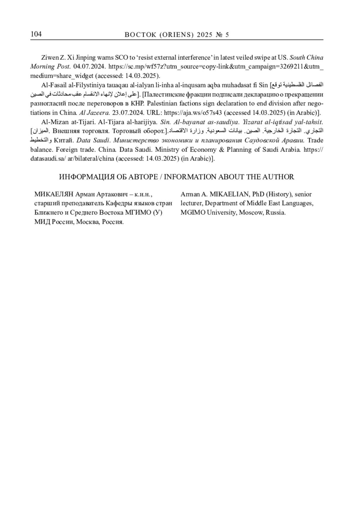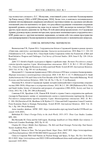 3. Мелкумян Е.С. Саудовская Аравия между США и Китаем в XXI веке: успешное балансирование. Мировая экономика и международные отношения. 2024. 68. № 5. С. 61-71.
