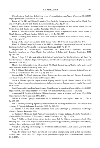 30. Al-Tamimi N. China and Saudi Arabia: From enmity to strategic hedging. Routledge handbook on China-Middle East relations. J. Fulton (ed.) London: Routledge, 2022. Pp. 137-154.