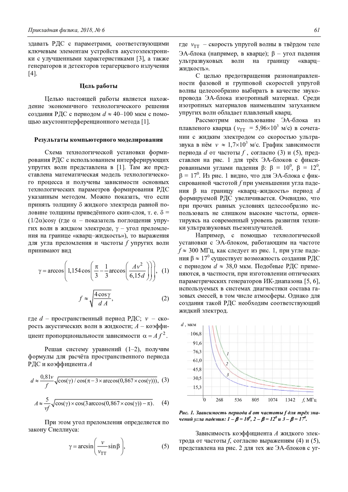 Оптимальным технологическим решением поставленной задачи следует считать использование интерферирующих упругих волн на частотах, близких к нижней границе СВЧ-диапазона (f 300 МГц), в сочетании с жидким электродом на основе водного раствора хлористого лития. Например, на данной частоте при угле падения 100 период РДС составляет d 80 мкм при использовании водного раствора LiCl, охлаждённого до T –32 оC.