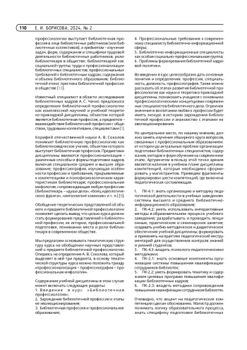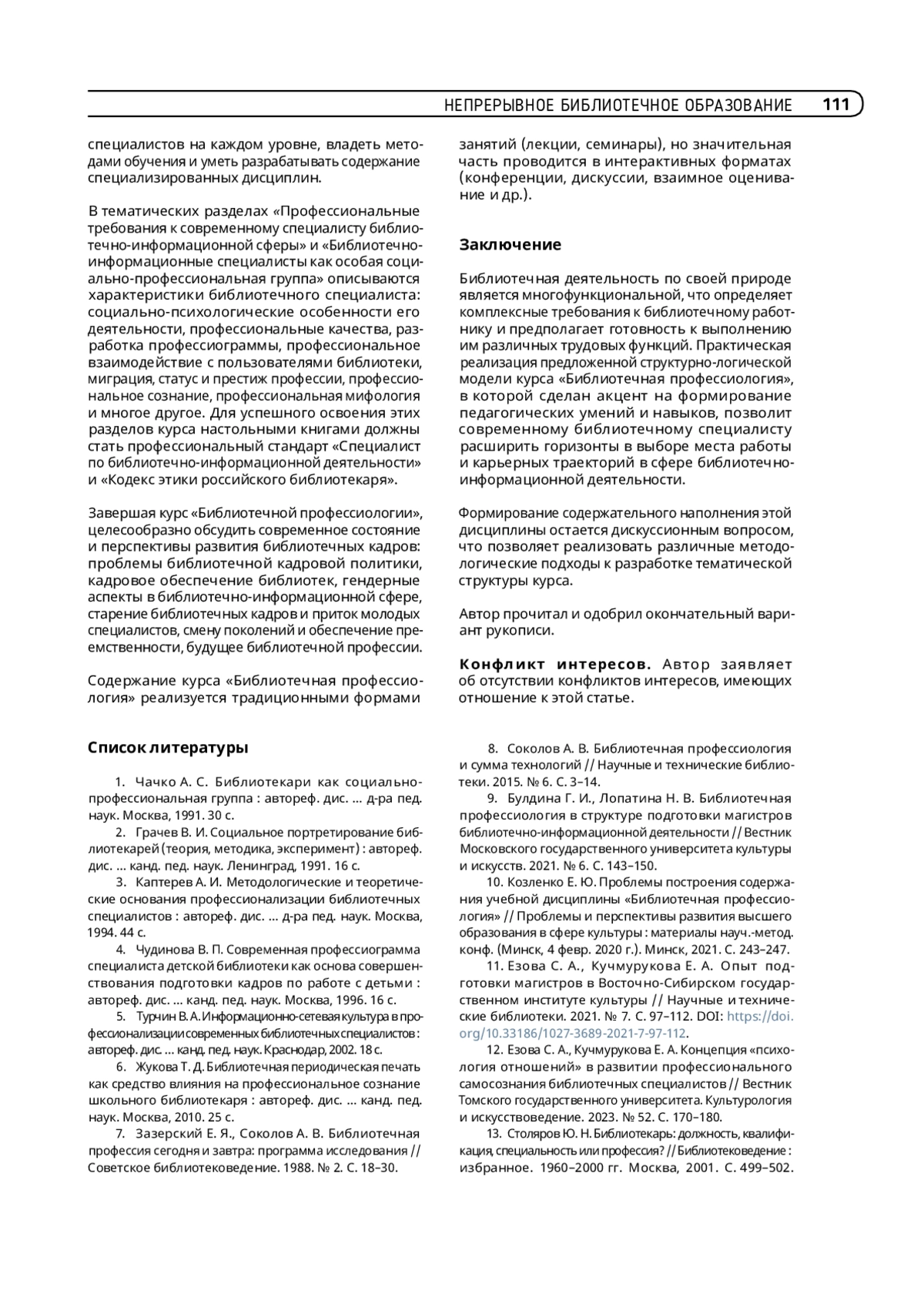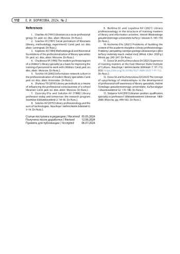 9. Булдина Г. И., Лопатина Н. В. Библиотечная профессиология в структуре подготовки магистров библиотечно-информационной деятельности // Вестник Московского государственного университета культуры и искусств. 2021. № 6. С. 143-150.